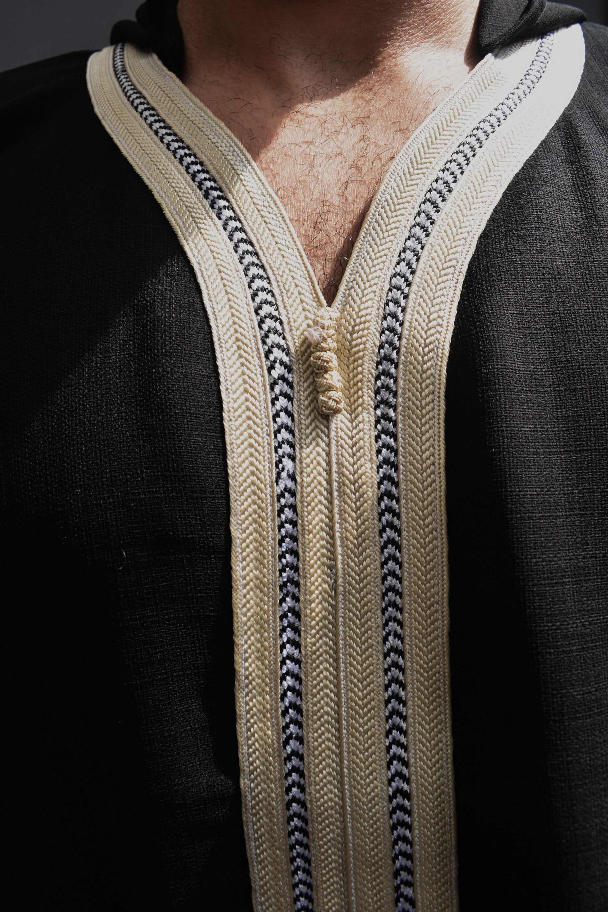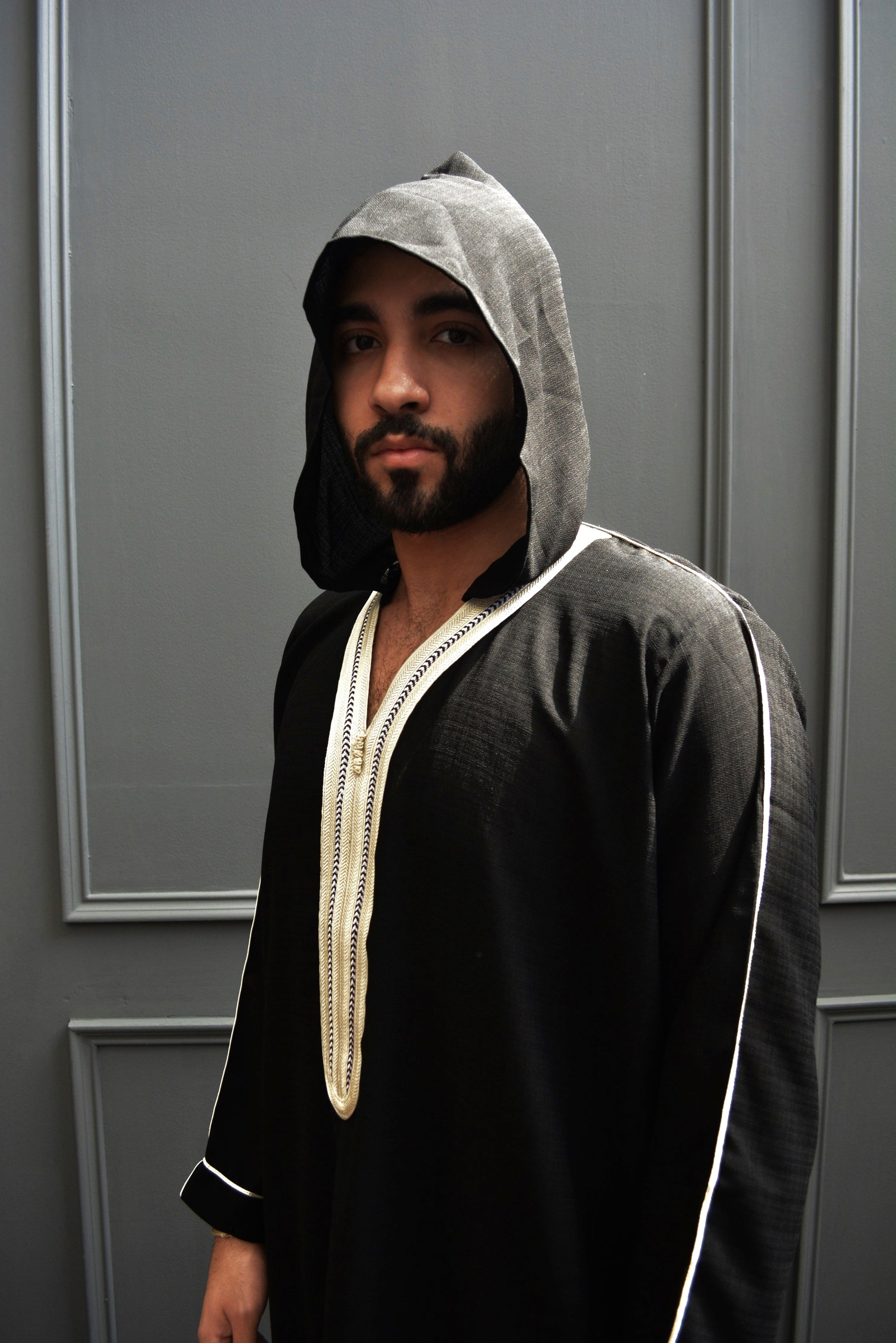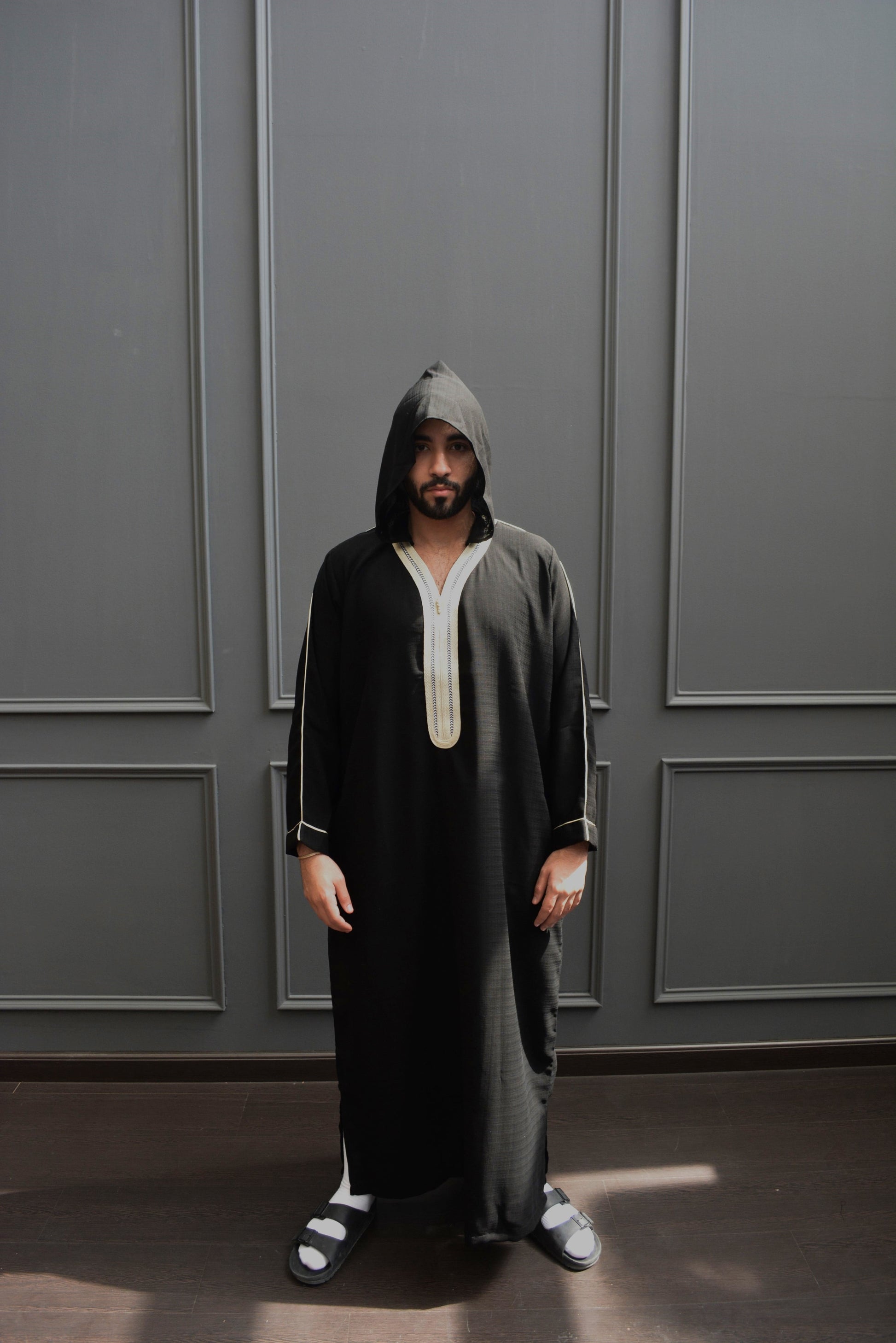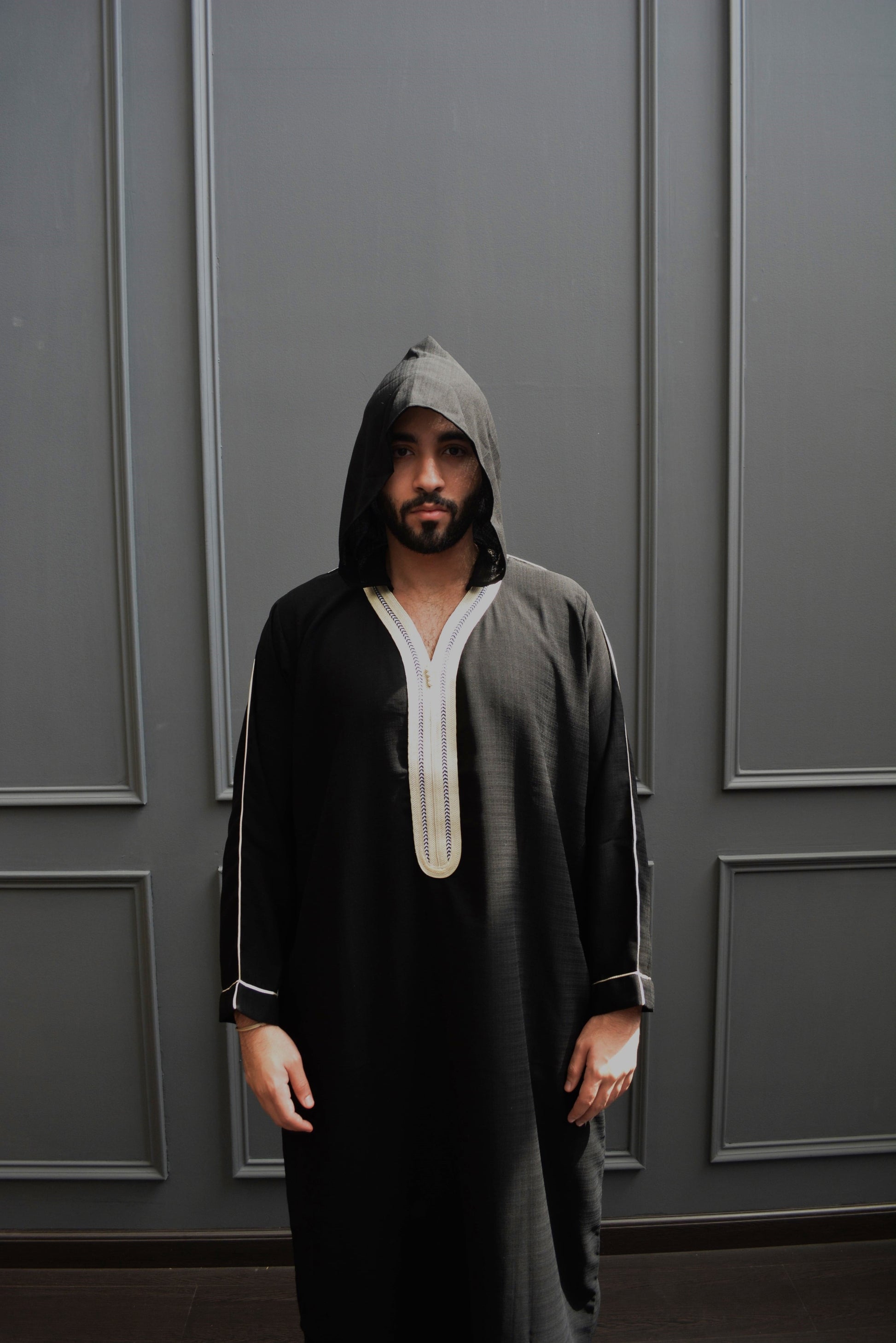 The best materials were used to make this elegant Moroccan thobe, but what really jumps out are the meticulous details of the tailor-made embroidery designs. This one-of-a-kind piece includes embroidery that begins at the shoulders and spreads to the V-neck, the chest region, the sleeves, and the bottom.