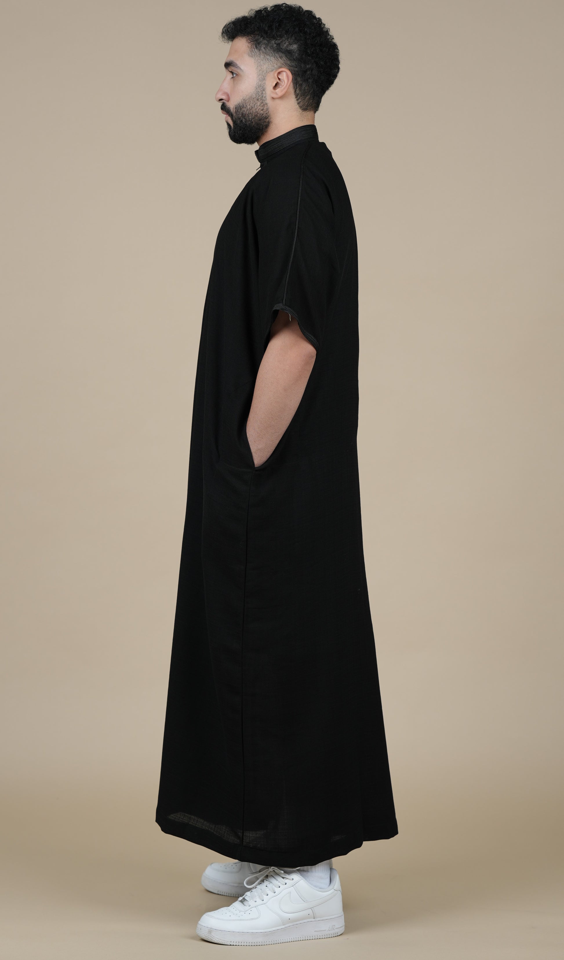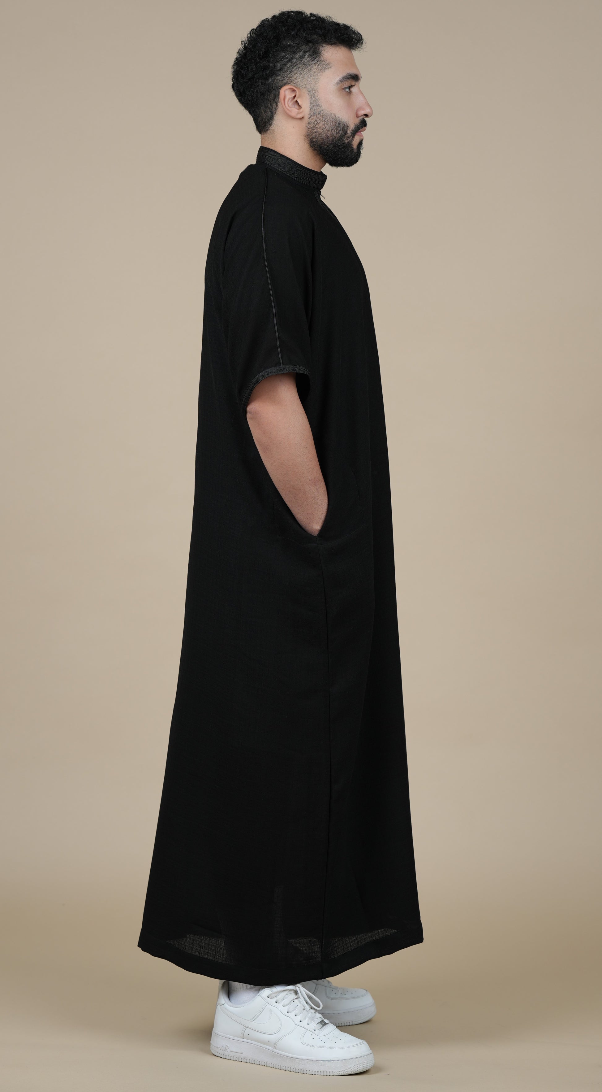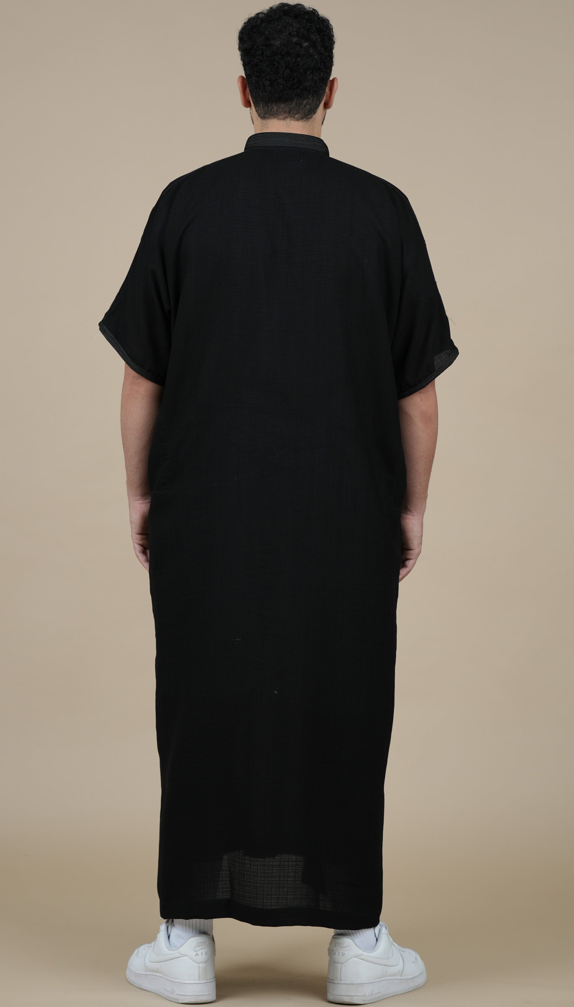 This elegant thobe was made using the softest materials, but what jumps out are the careful details of the tailor-made embroidery designs. This piece includes embroidery that begins at the shoulders and spreads to the chest region, the sleeves, and the bottom.