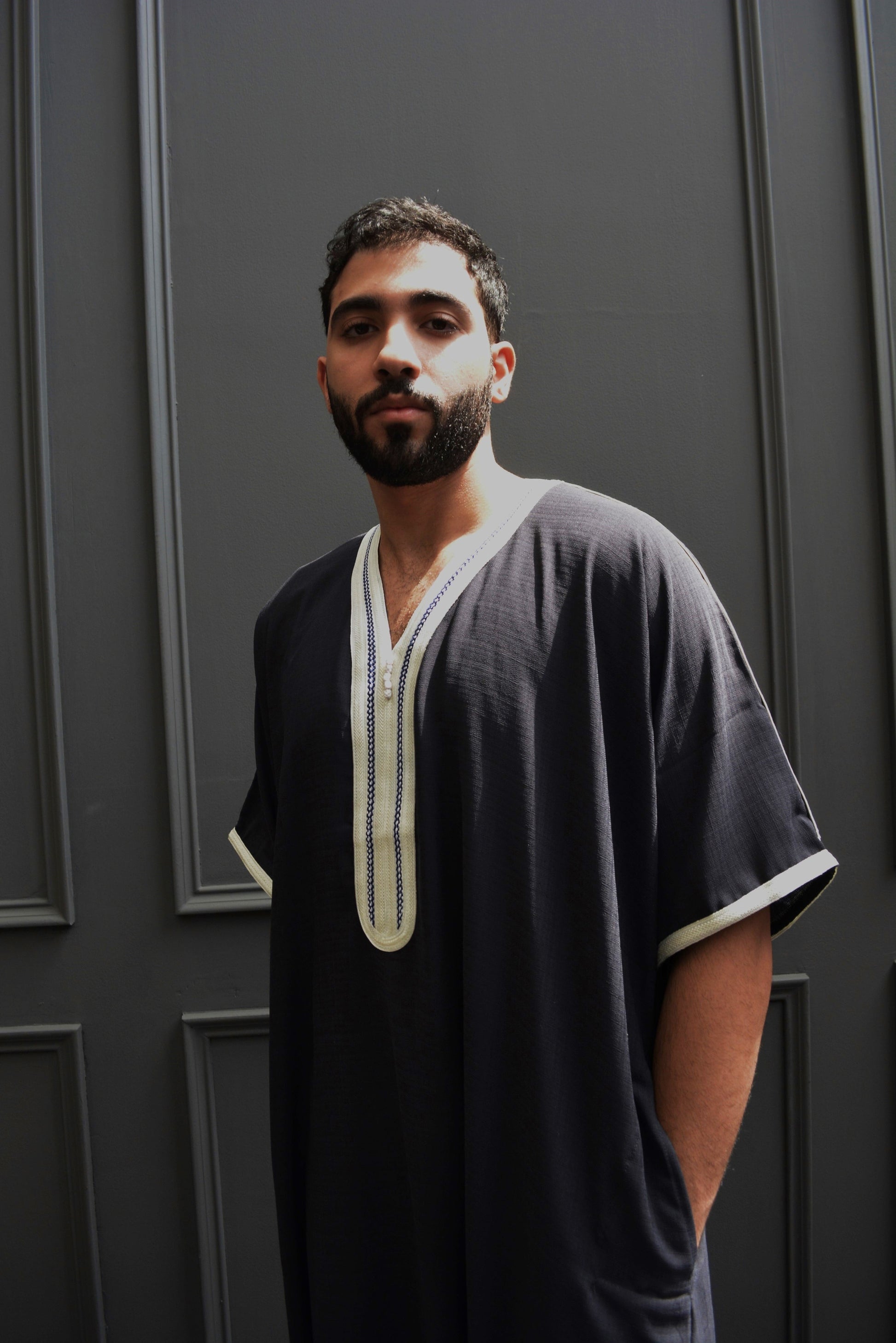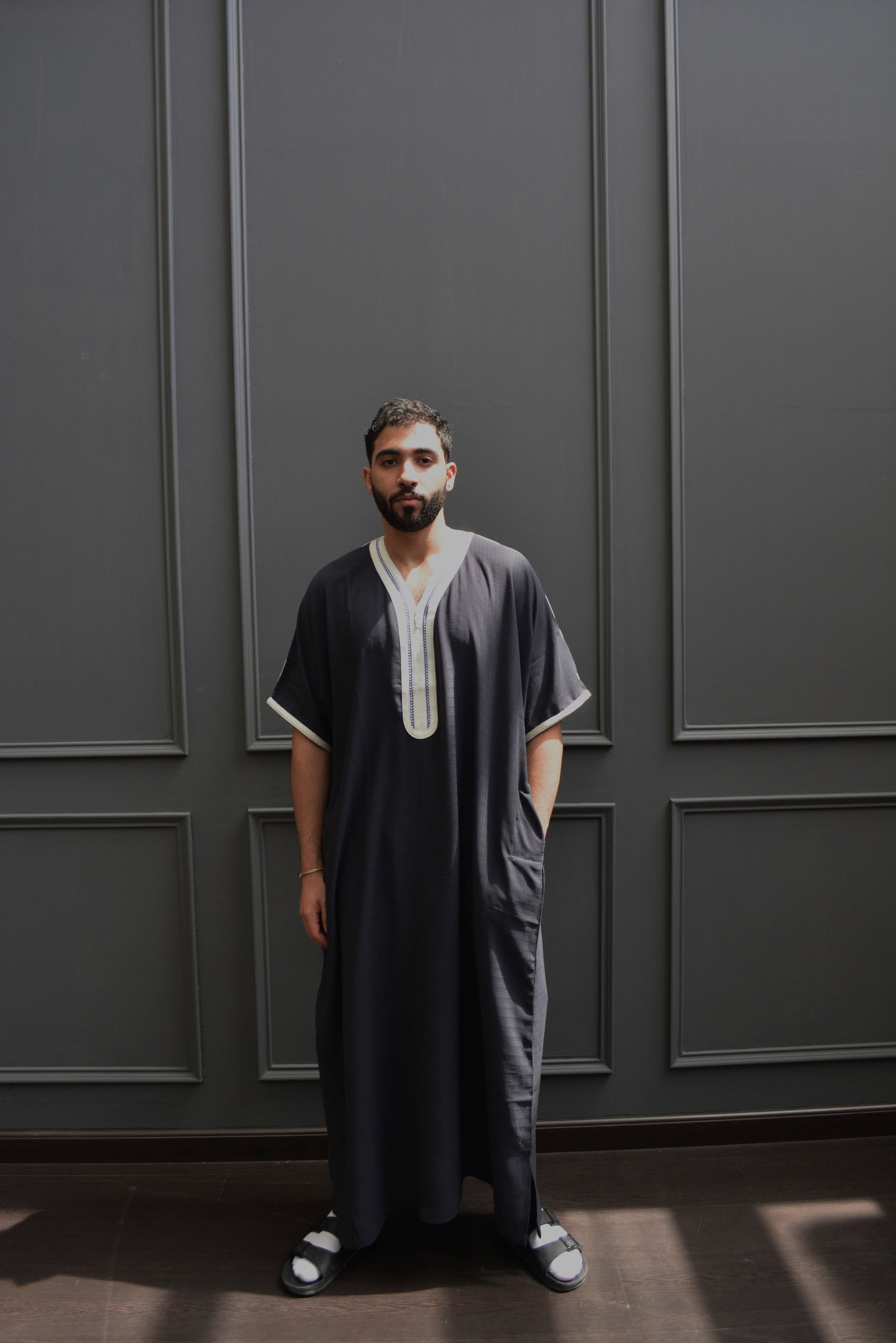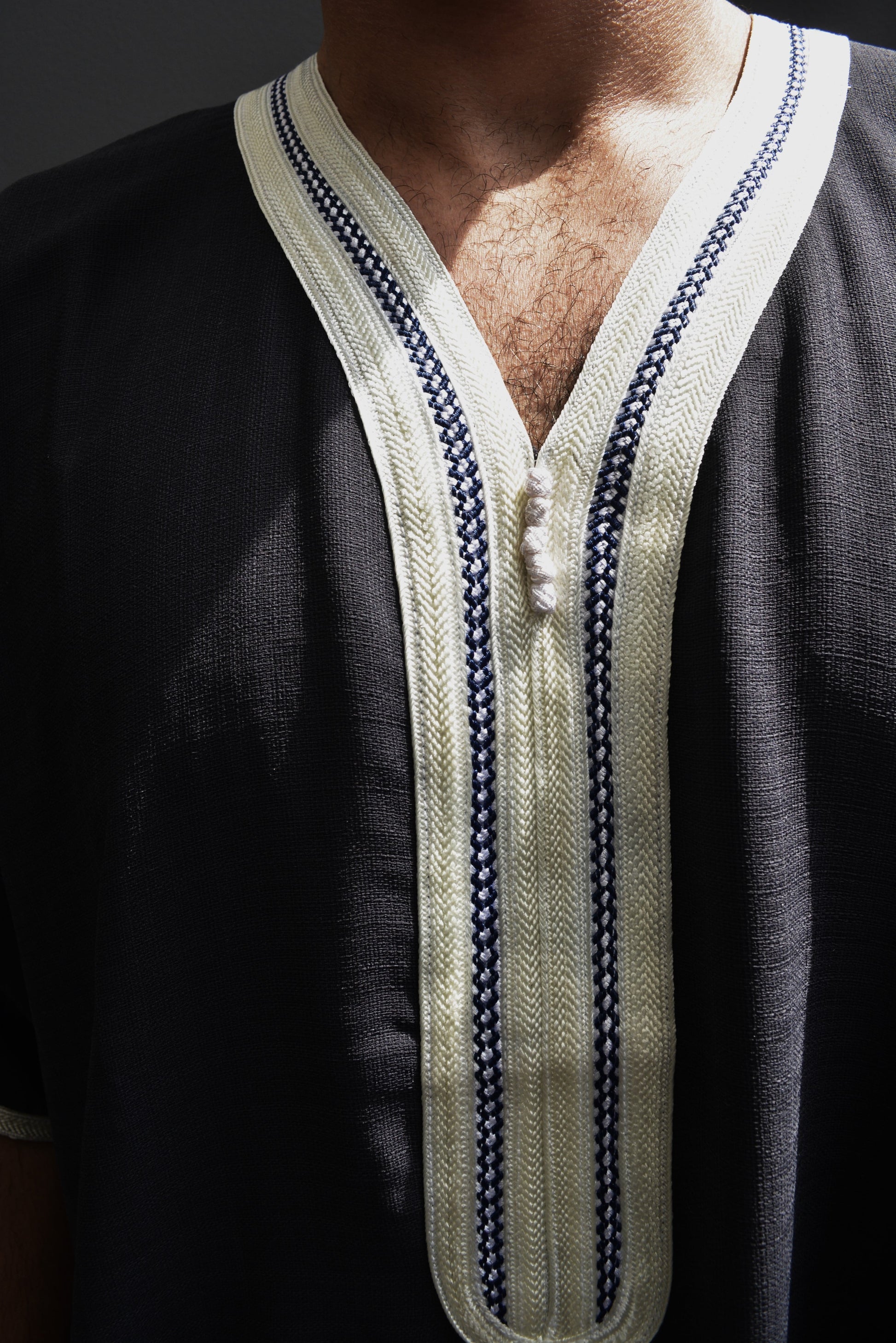 The best materials were used to make this elegant Moroccan thobe, but what really jumps out are the meticulous details of the tailor-made embroidery designs. This one-of-a-kind piece includes embroidery that begins at the shoulders and spreads to the V-neck, the chest region, the sleeves, and the bottom.