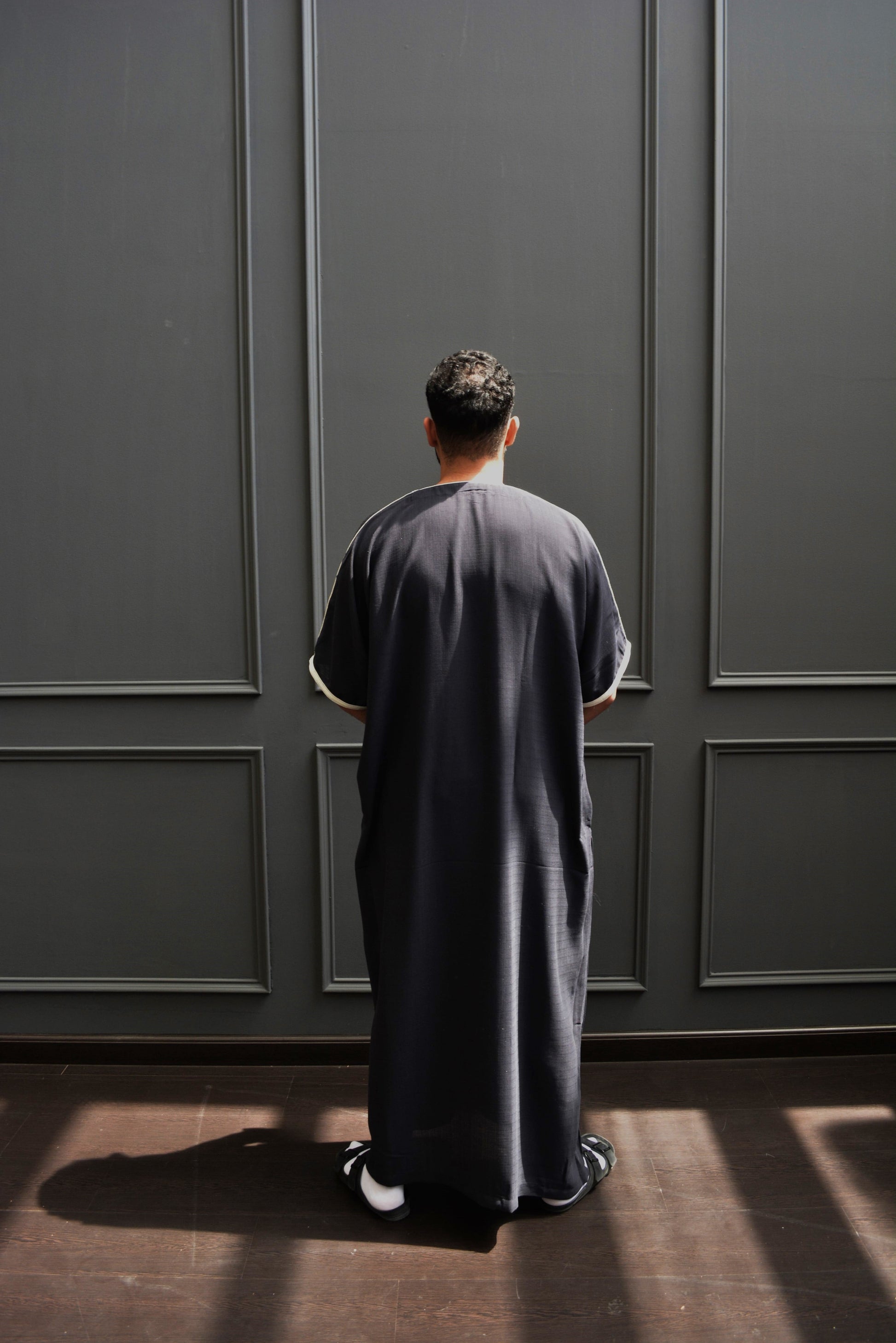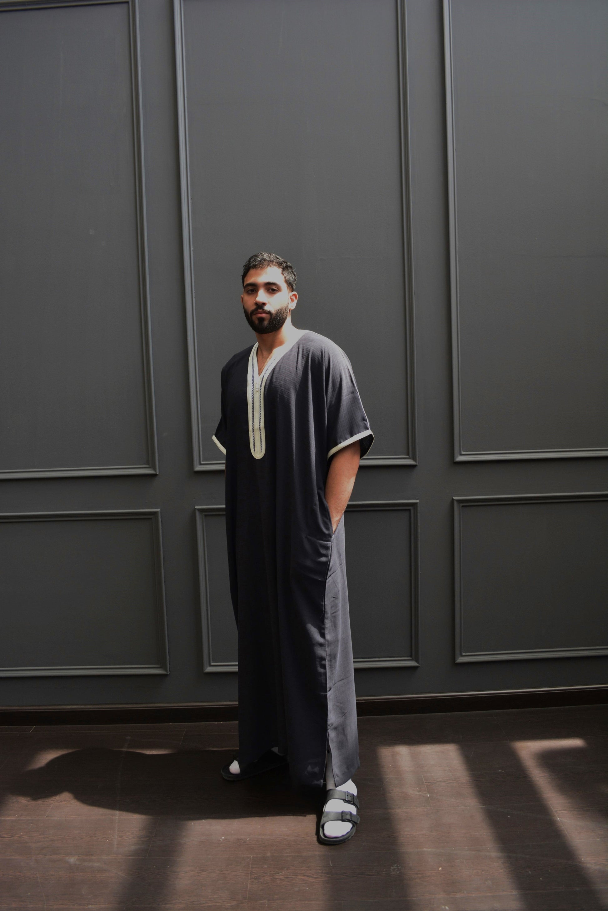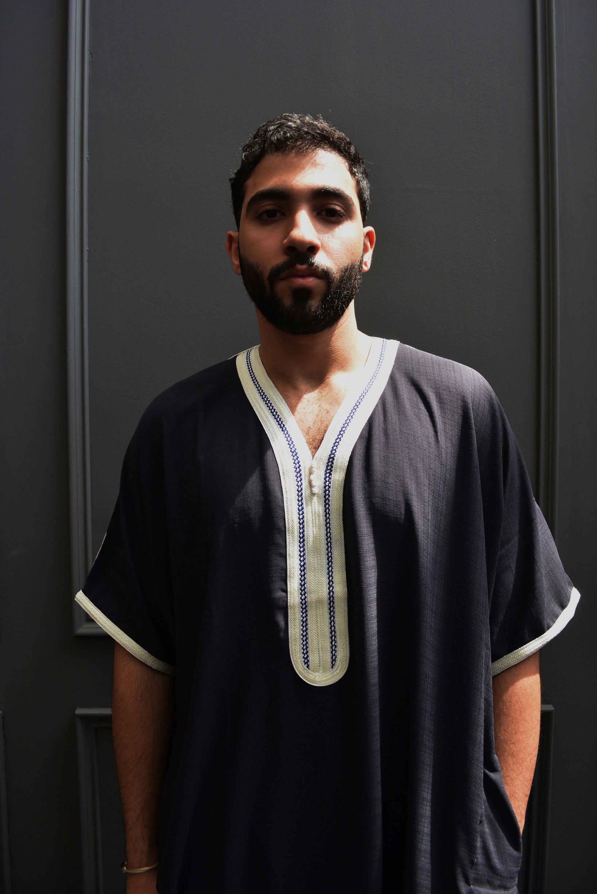 The best materials were used to make this elegant Moroccan thobe, but what really jumps out are the meticulous details of the tailor-made embroidery designs. This one-of-a-kind piece includes embroidery that begins at the shoulders and spreads to the V-neck, the chest region, the sleeves, and the bottom.