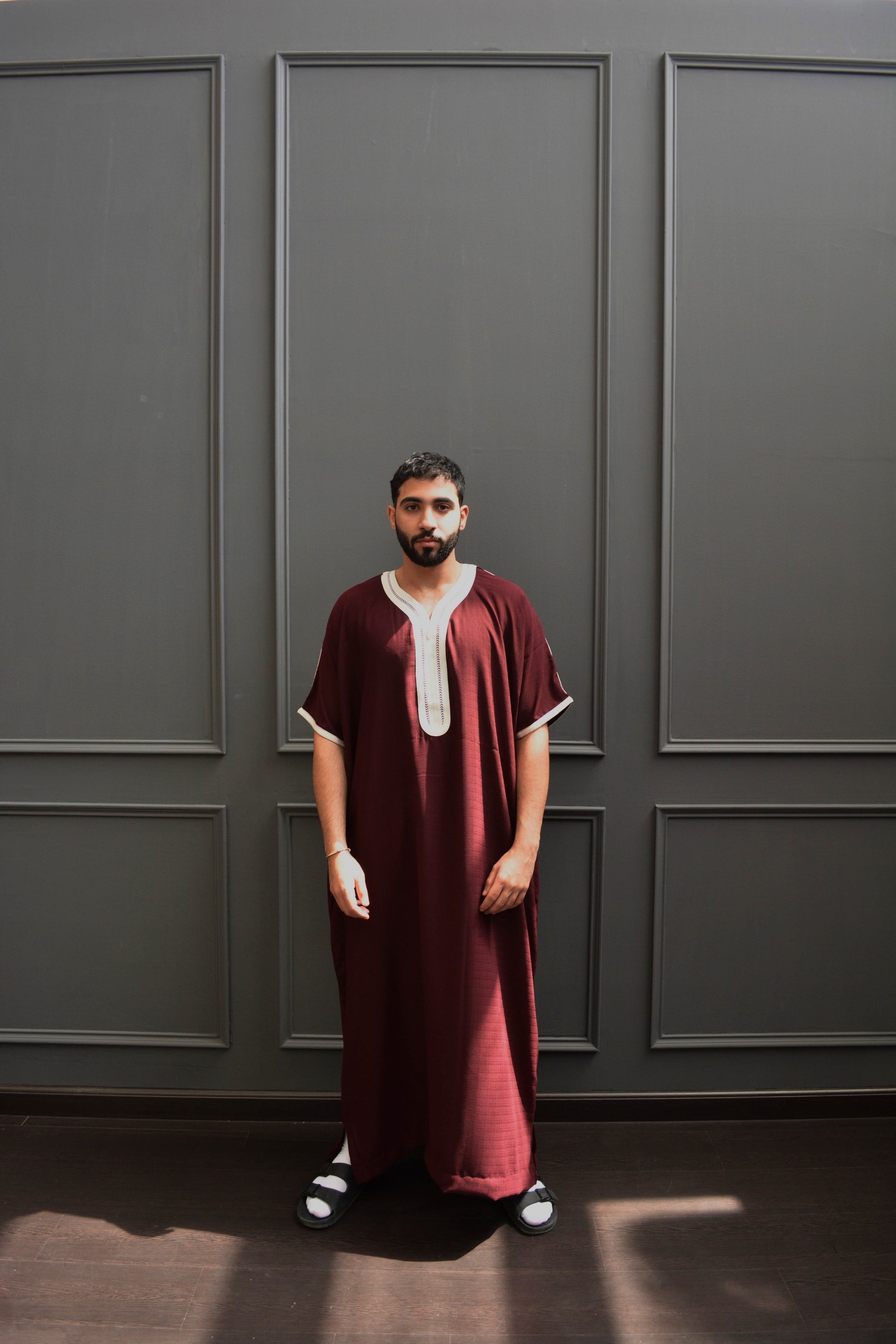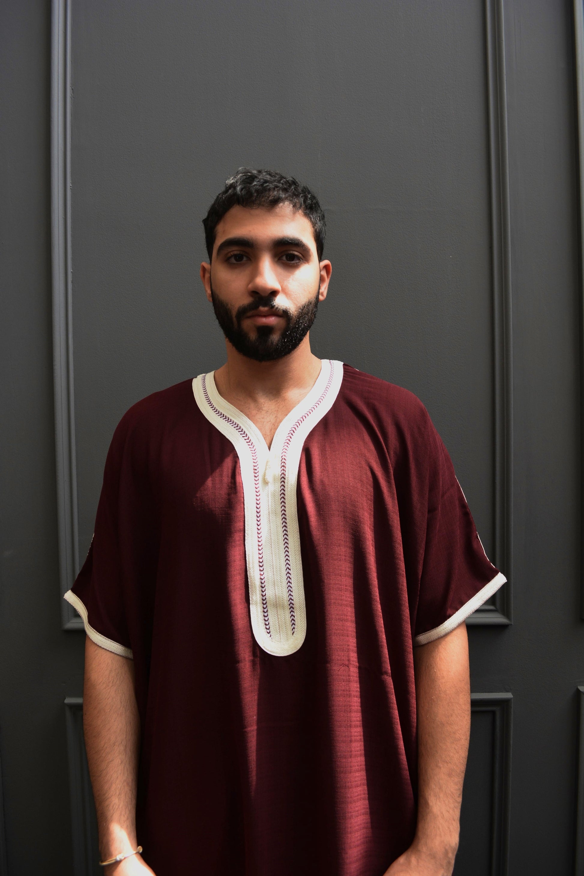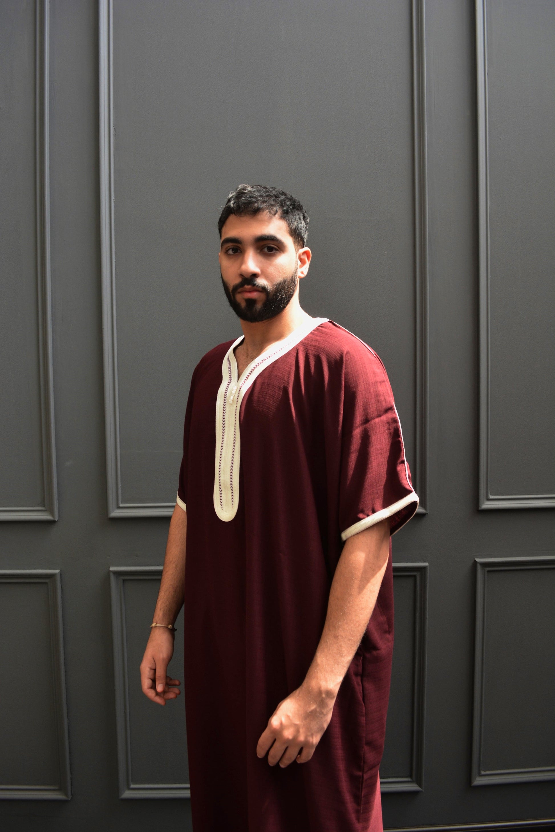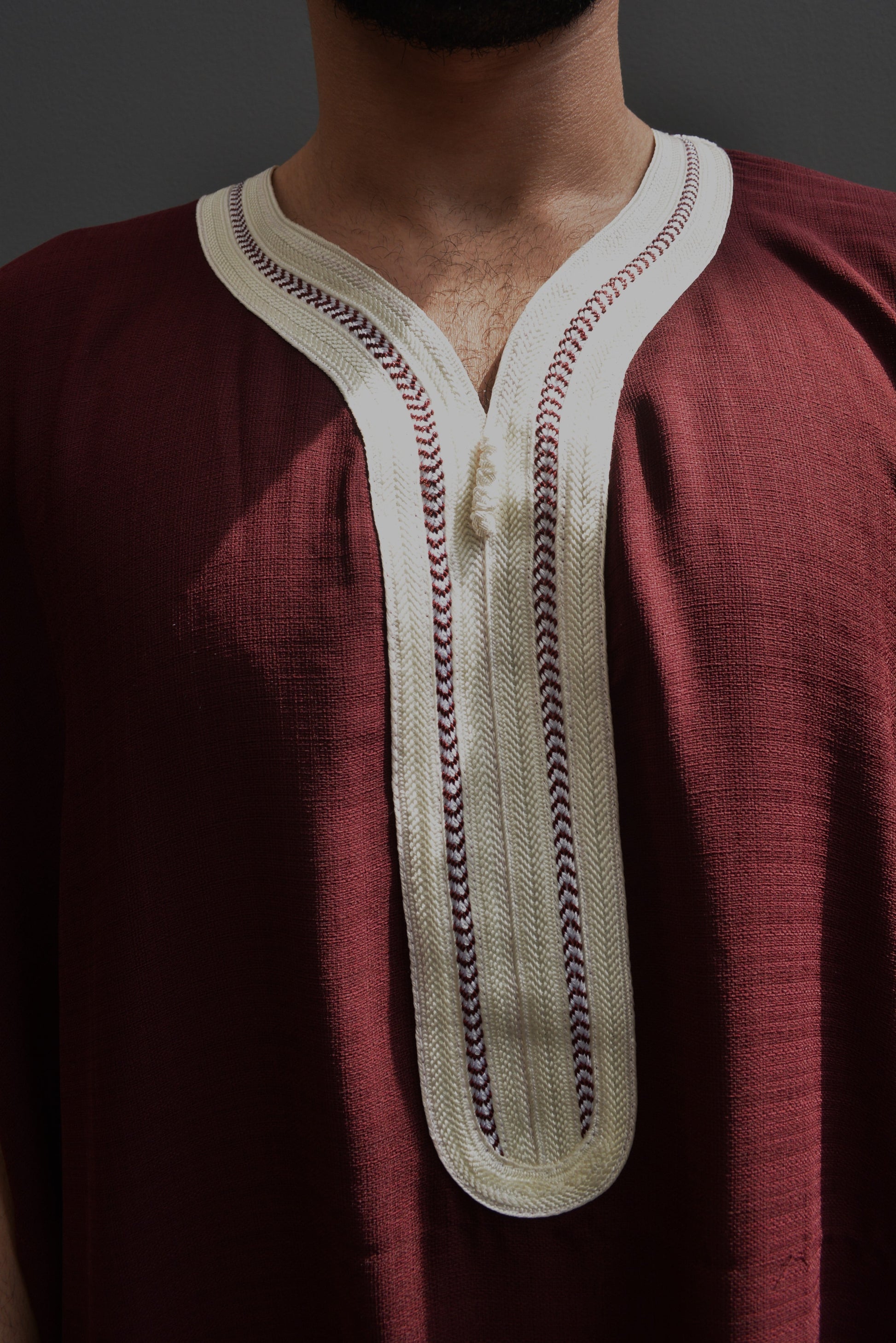 The best materials were used to make this elegant Moroccan thobe, but what really jumps out are the meticulous details of the tailor-made embroidery designs. This one-of-a-kind piece includes embroidery that begins at the shoulders and spreads to the V-neck, the chest region, the sleeves, and the bottom.