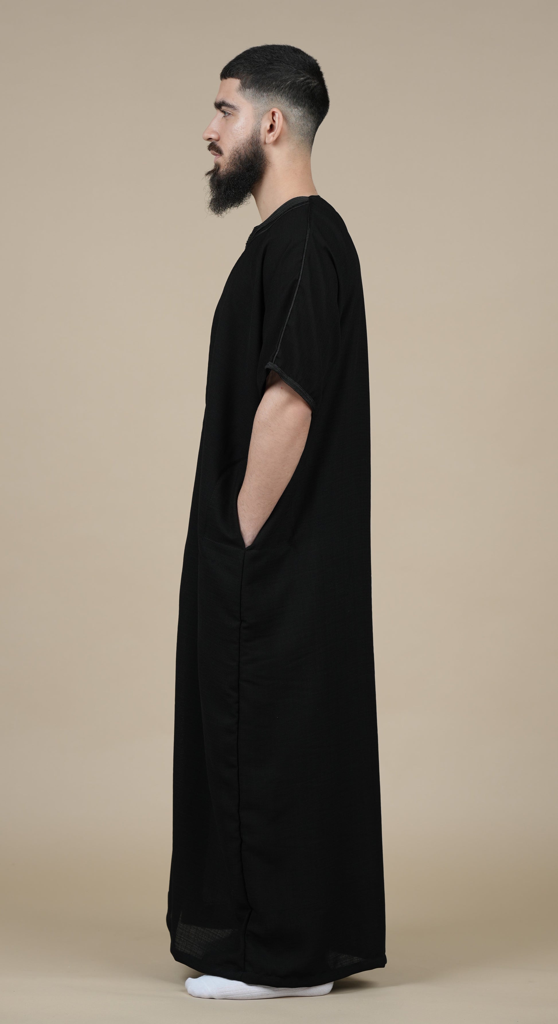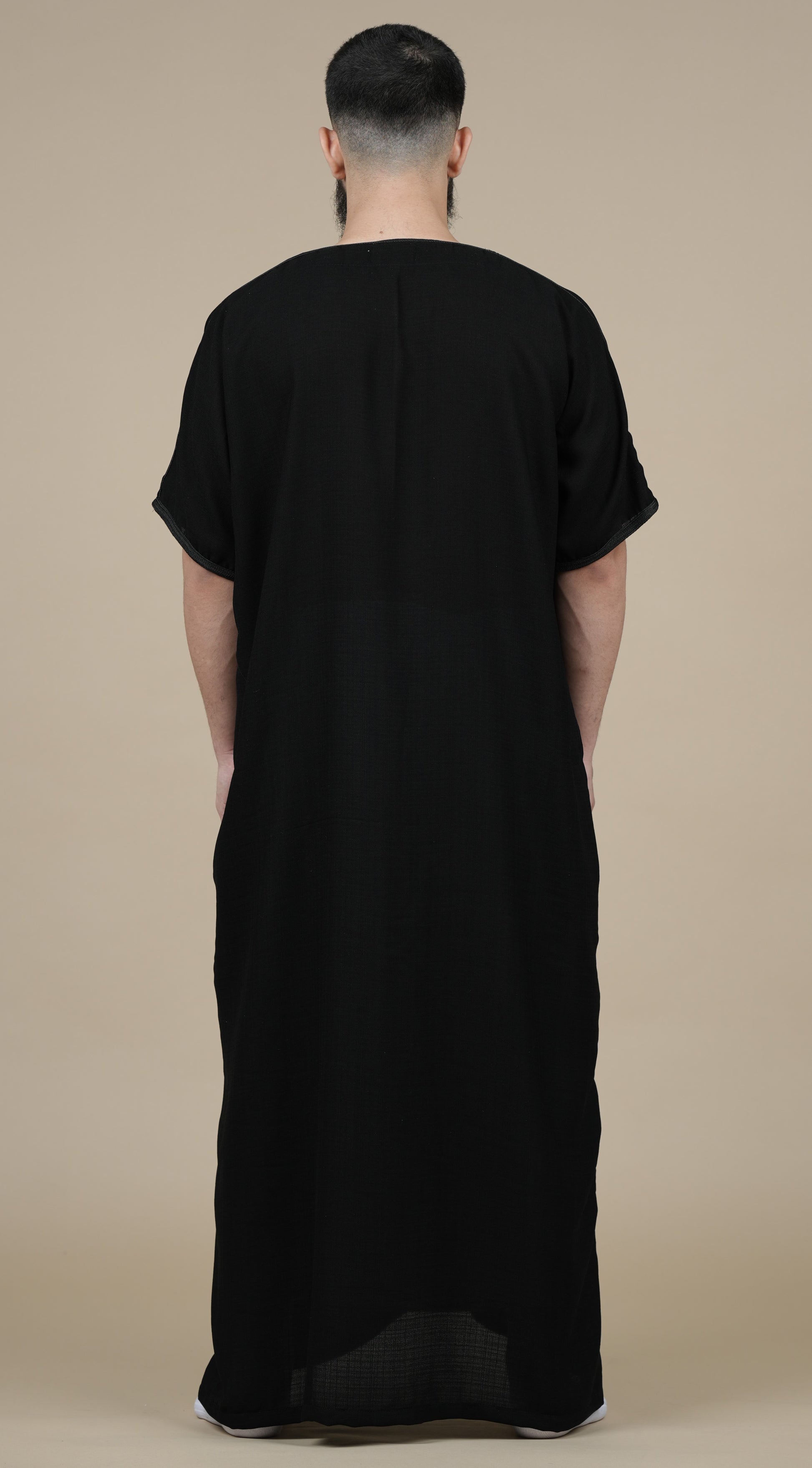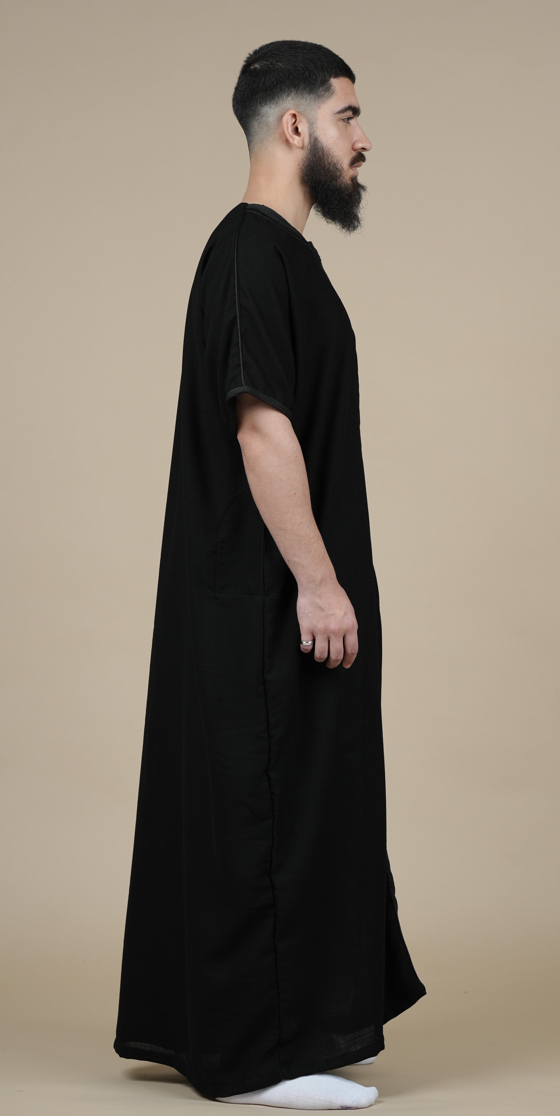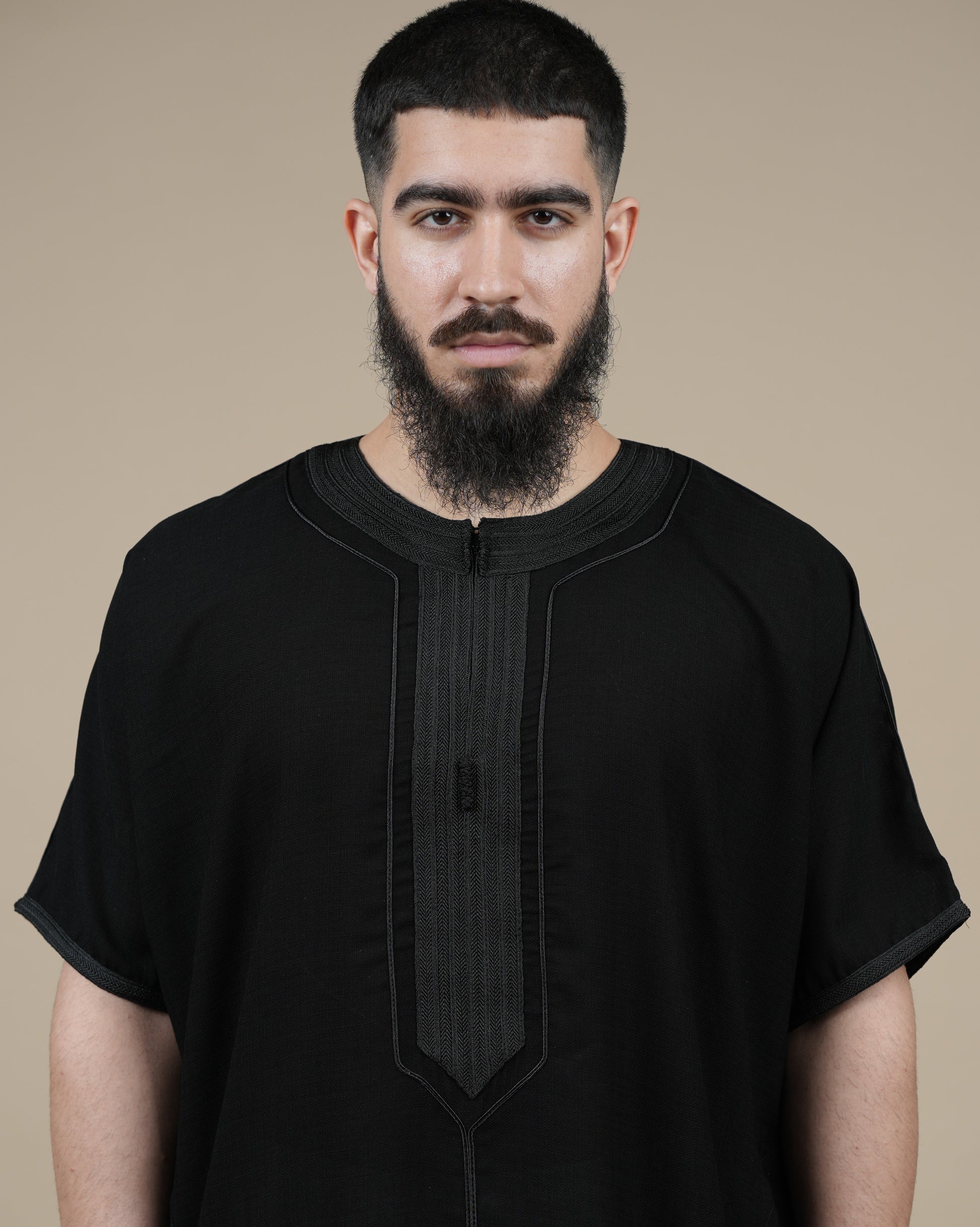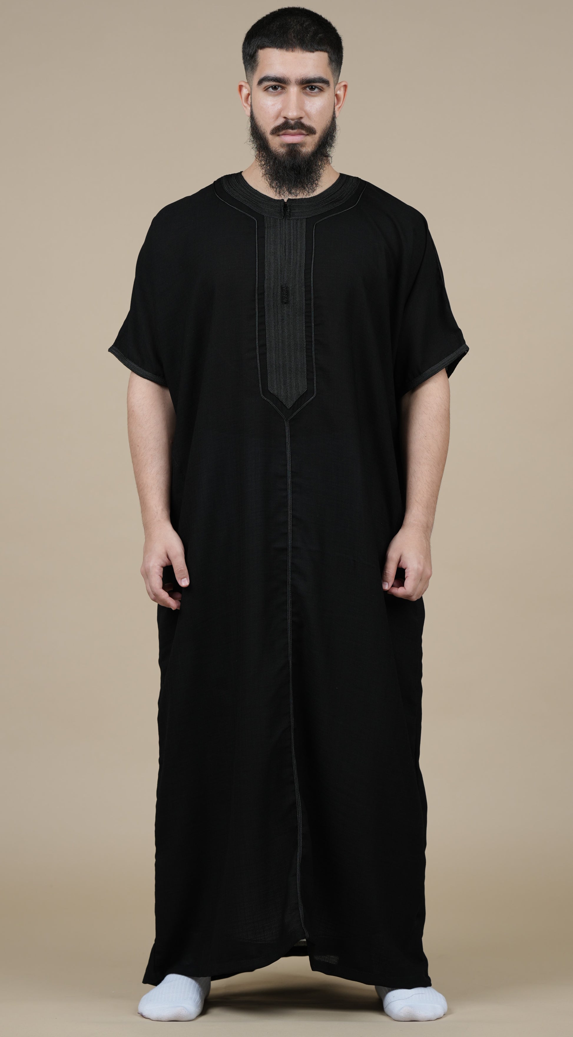 The best materials were used to make this elegant Moroccan thobe, but what really jumps out are the meticulous details of the tailor-made embroidery designs. This one-of-a-kind piece includes embroidery that begins at the shoulders and spreads to the chest region, the sleeves, and the bottom.