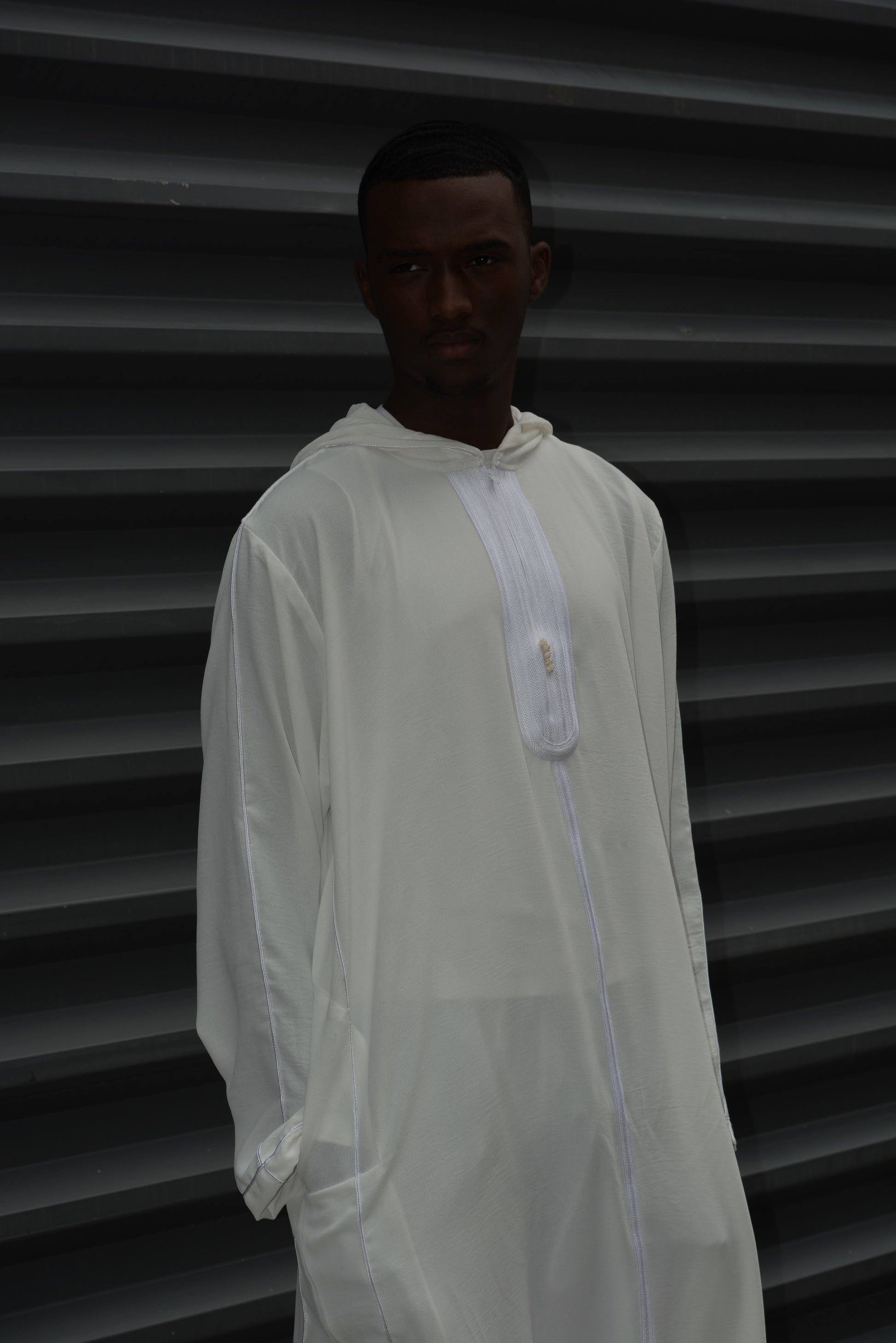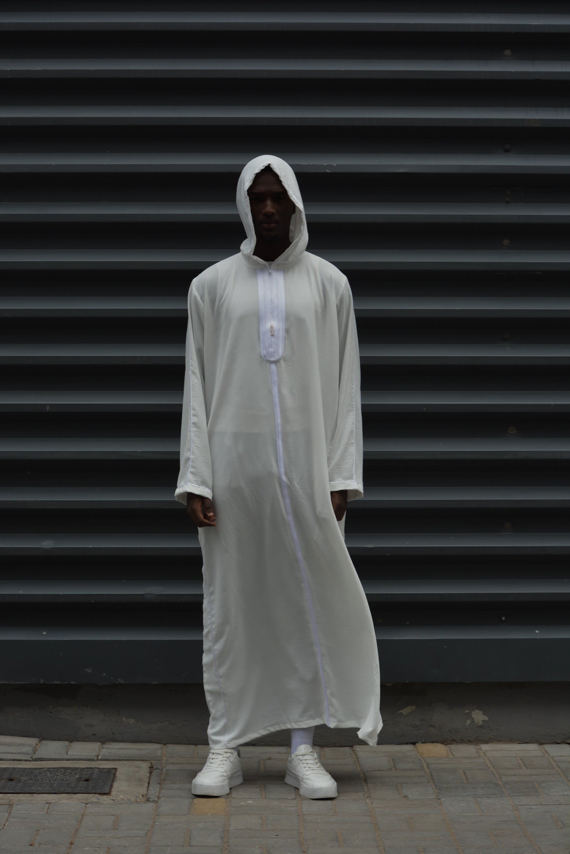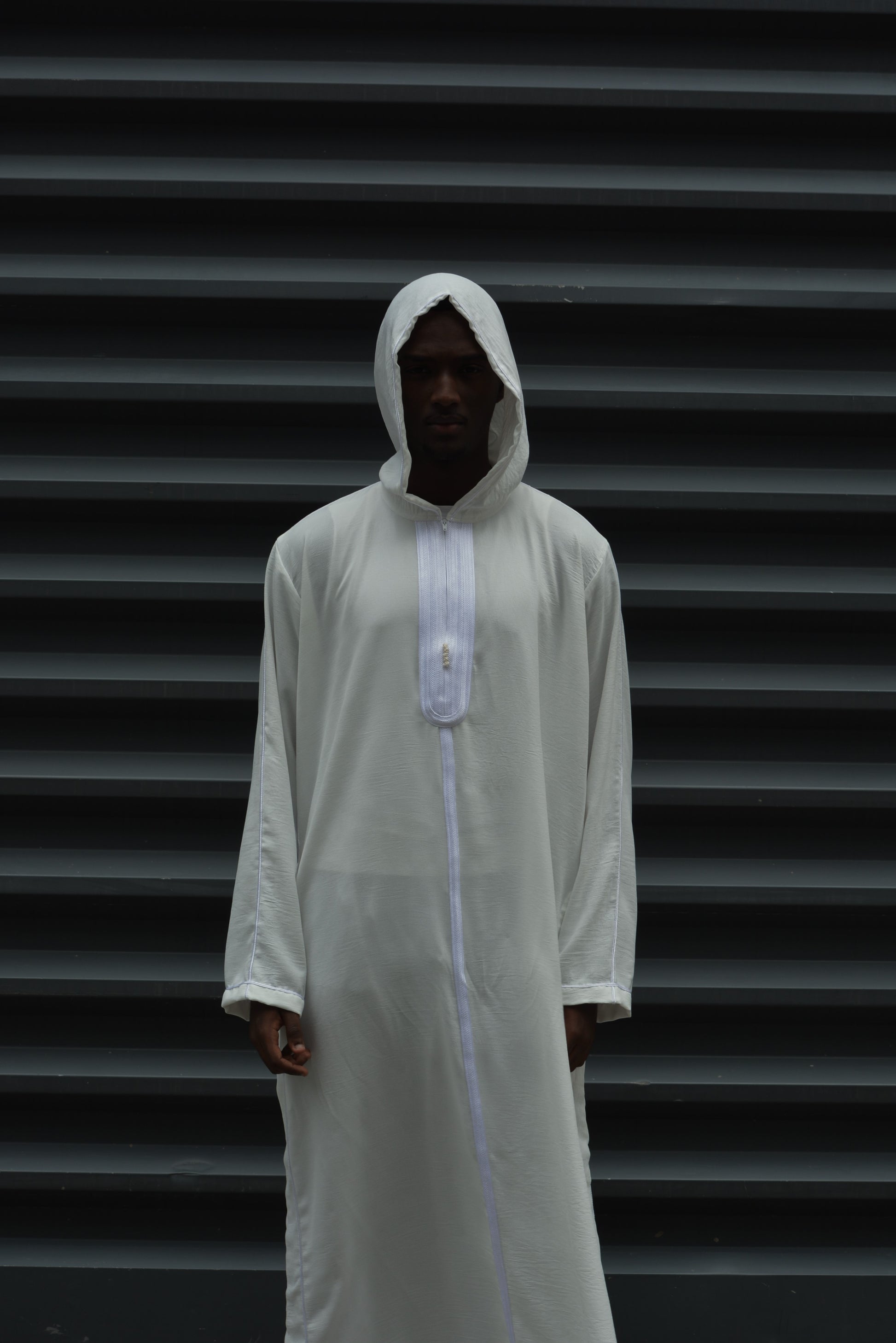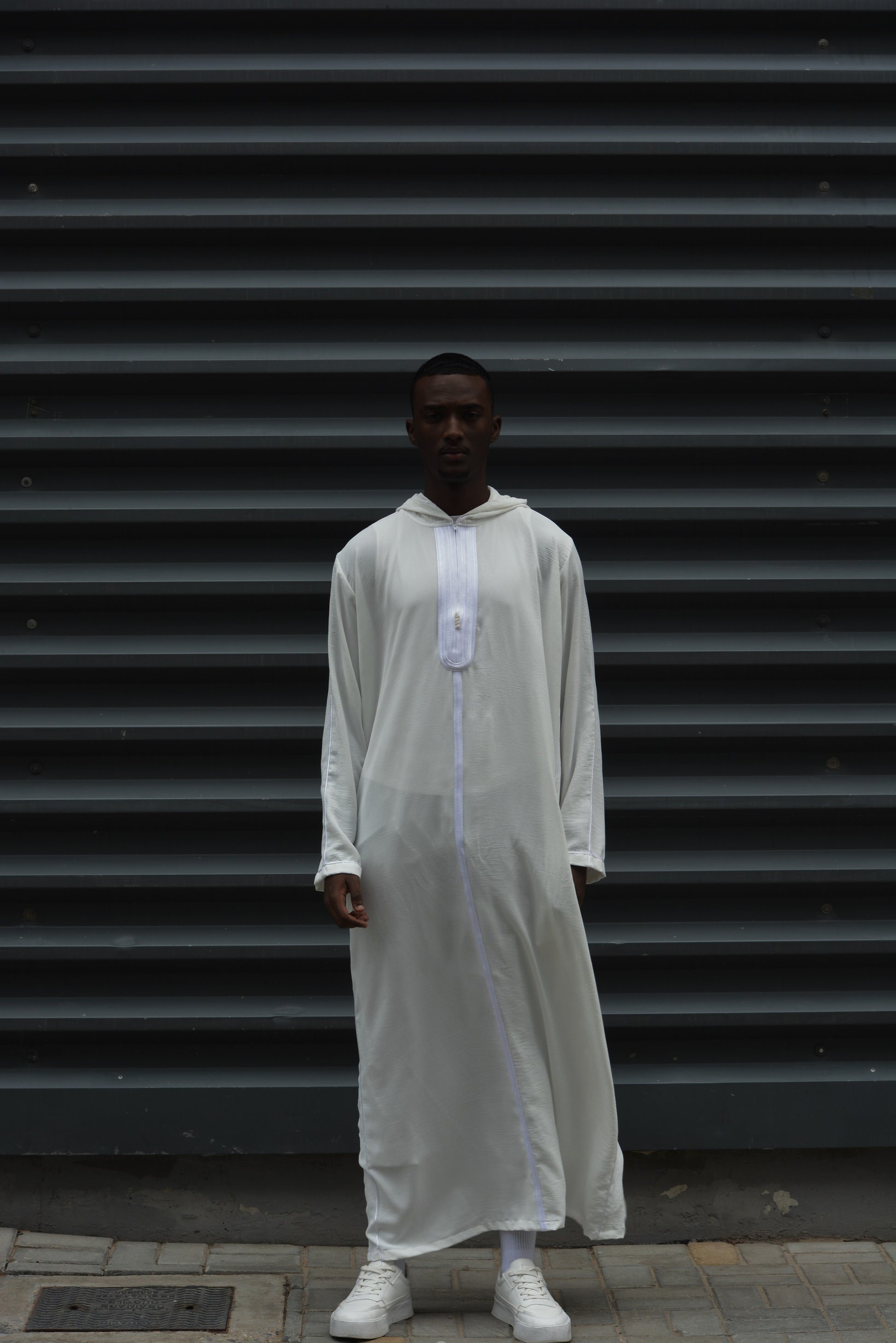 The best materials were used to make this elegant Moroccan thobe, but what really jumps out are the meticulous details of the tailor-made embroidery designs. This one-of-a-kind piece includes embroidery that begins at the shoulders and spreads to the chest region, the sleeves, and the bottom.
