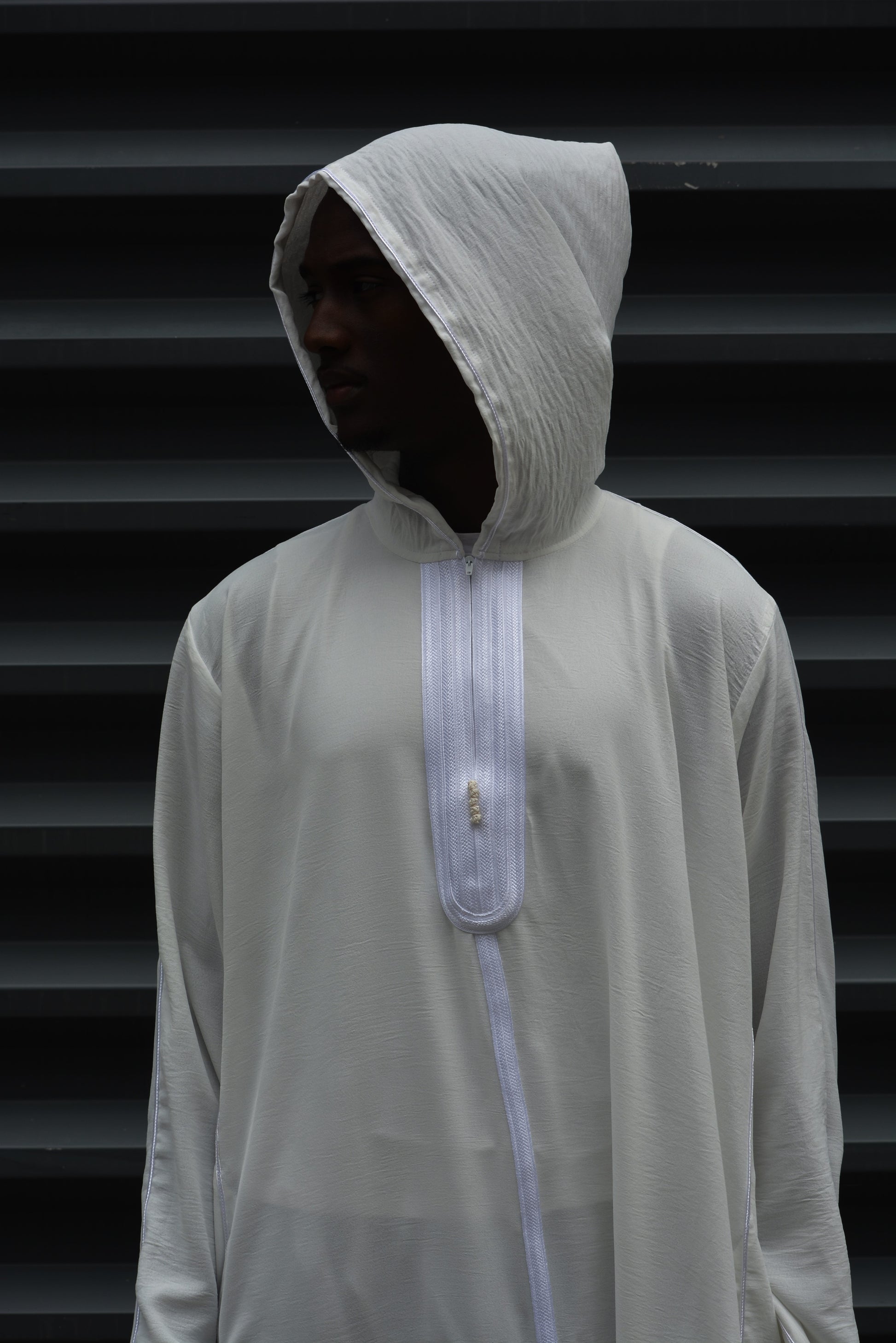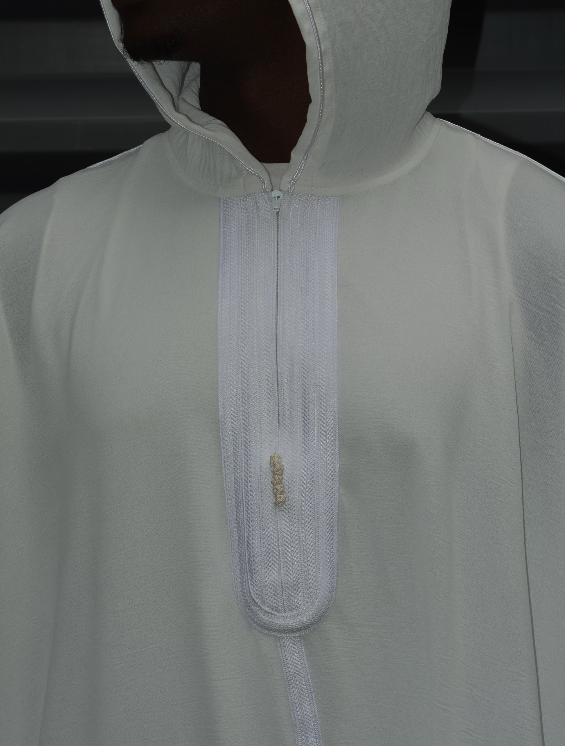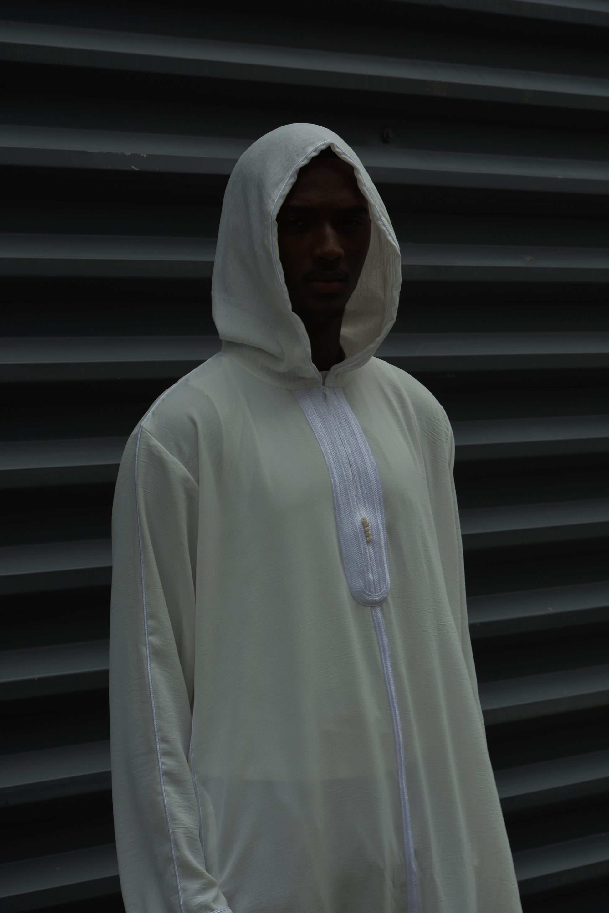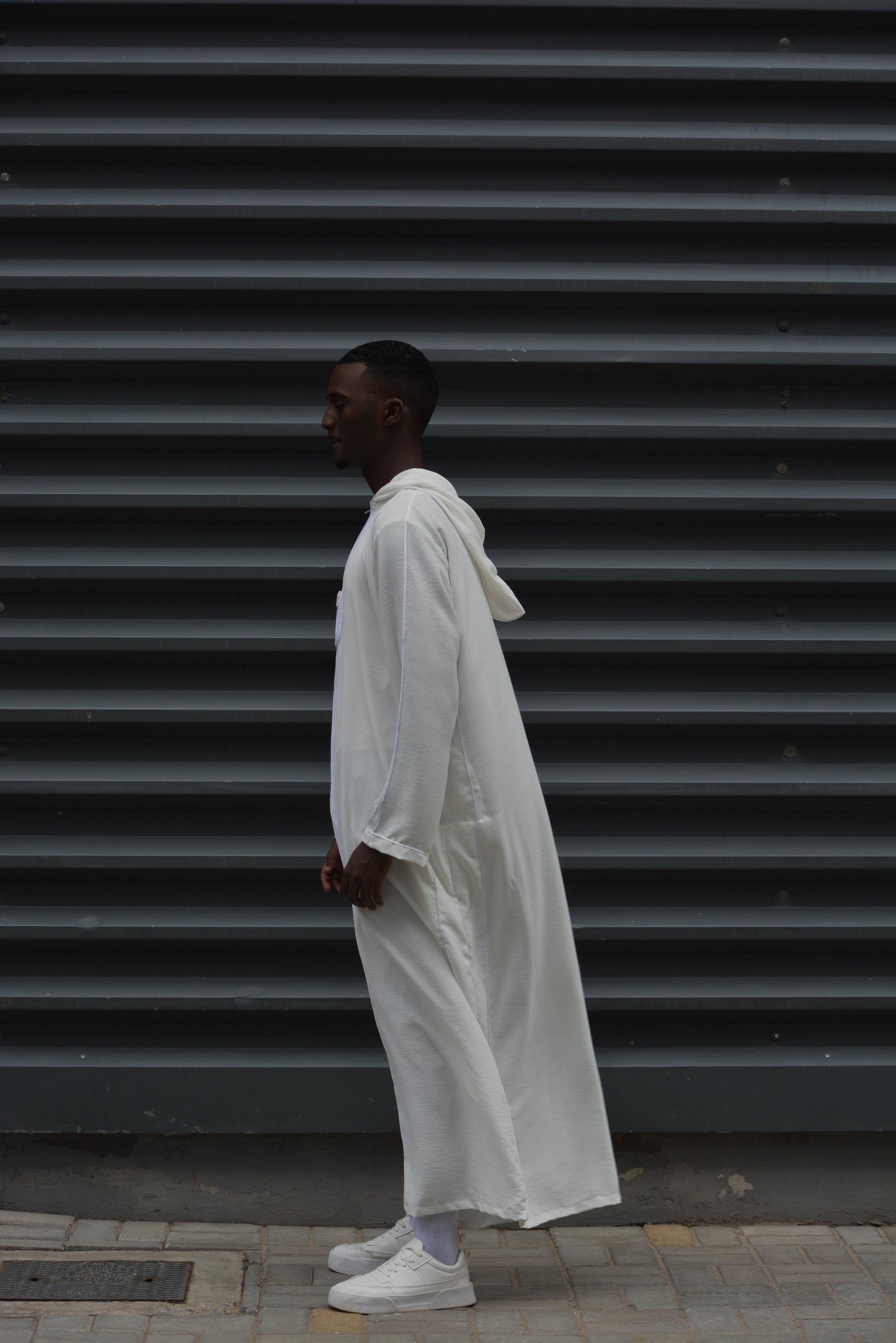 The best materials were used to make this elegant Moroccan thobe, but what really jumps out are the meticulous details of the tailor-made embroidery designs. This one-of-a-kind piece includes embroidery that begins at the shoulders and spreads to the chest region, the sleeves, and the bottom.