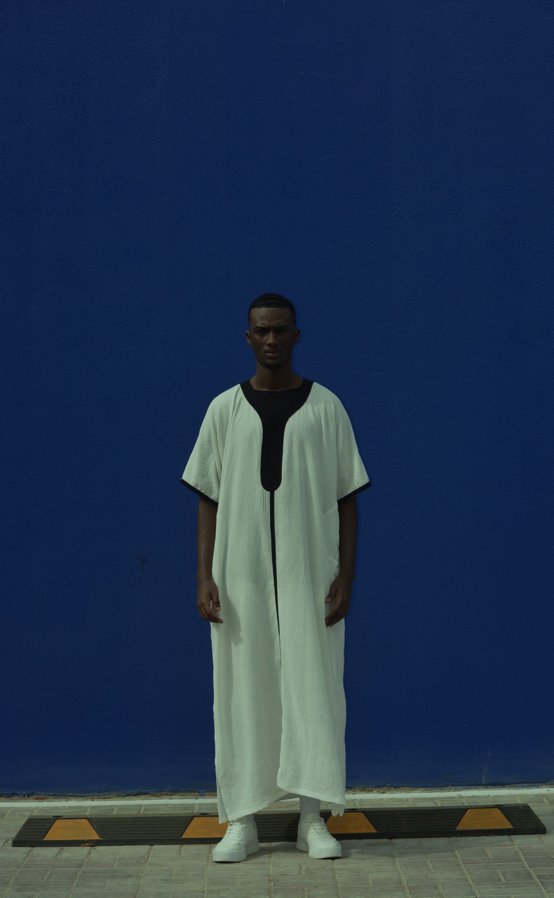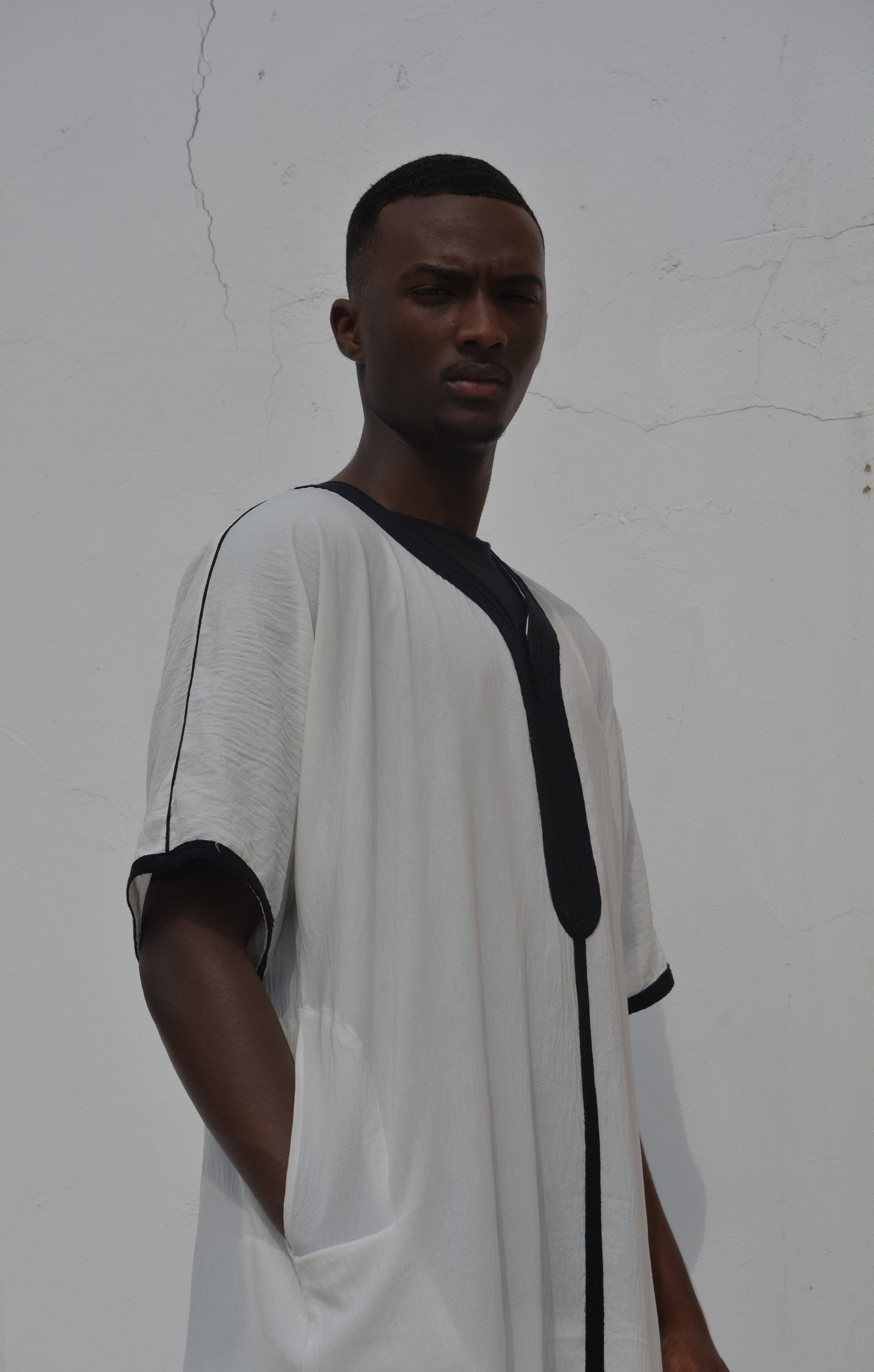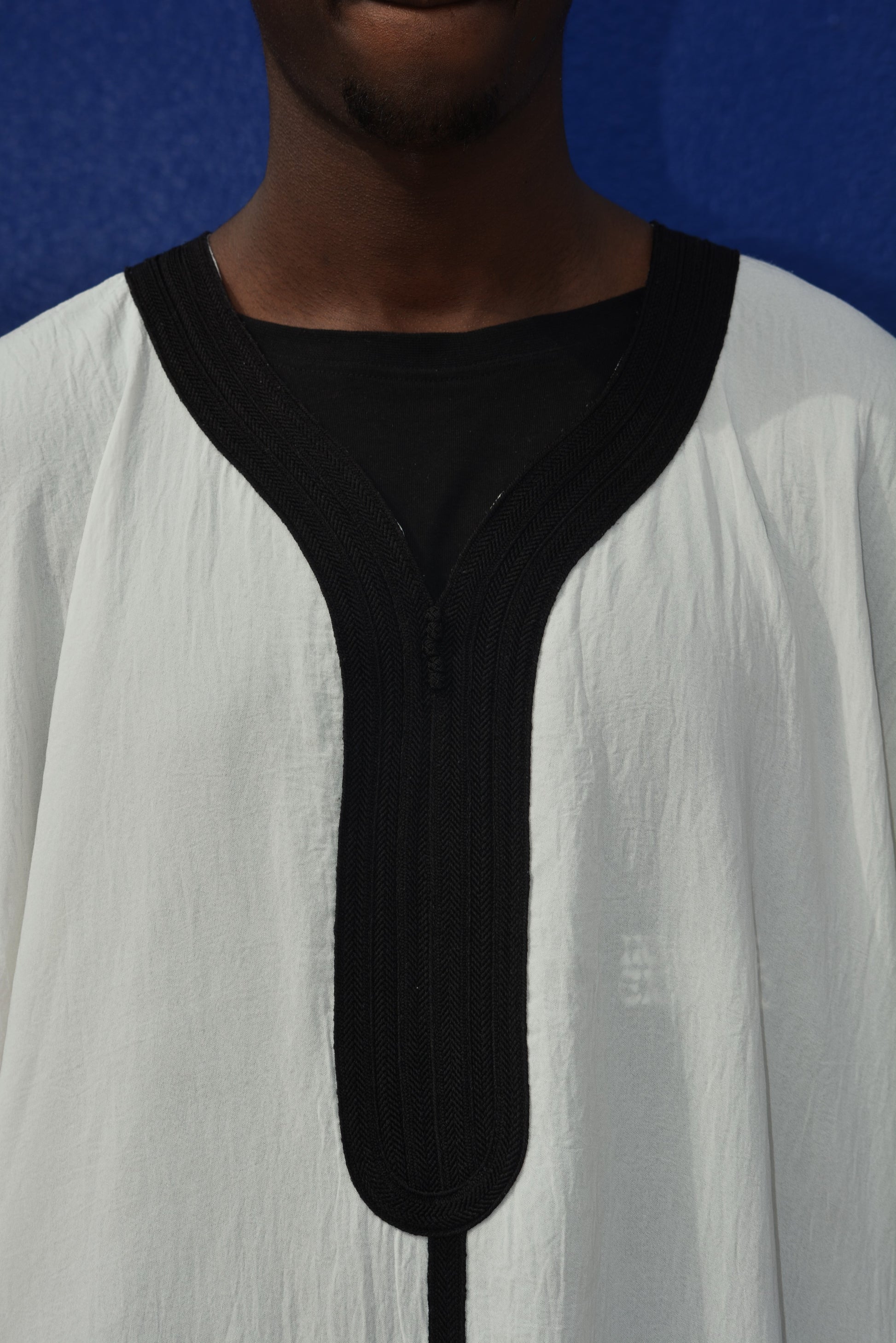 The best materials were used to make this elegant Moroccan thobe, but what really jumps out are the meticulous details of the tailor-made embroidery designs. This one-of-a-kind piece includes embroidery that begins at the shoulders and spreads to the V-neck, the chest region, the sleeves, and the bottom.