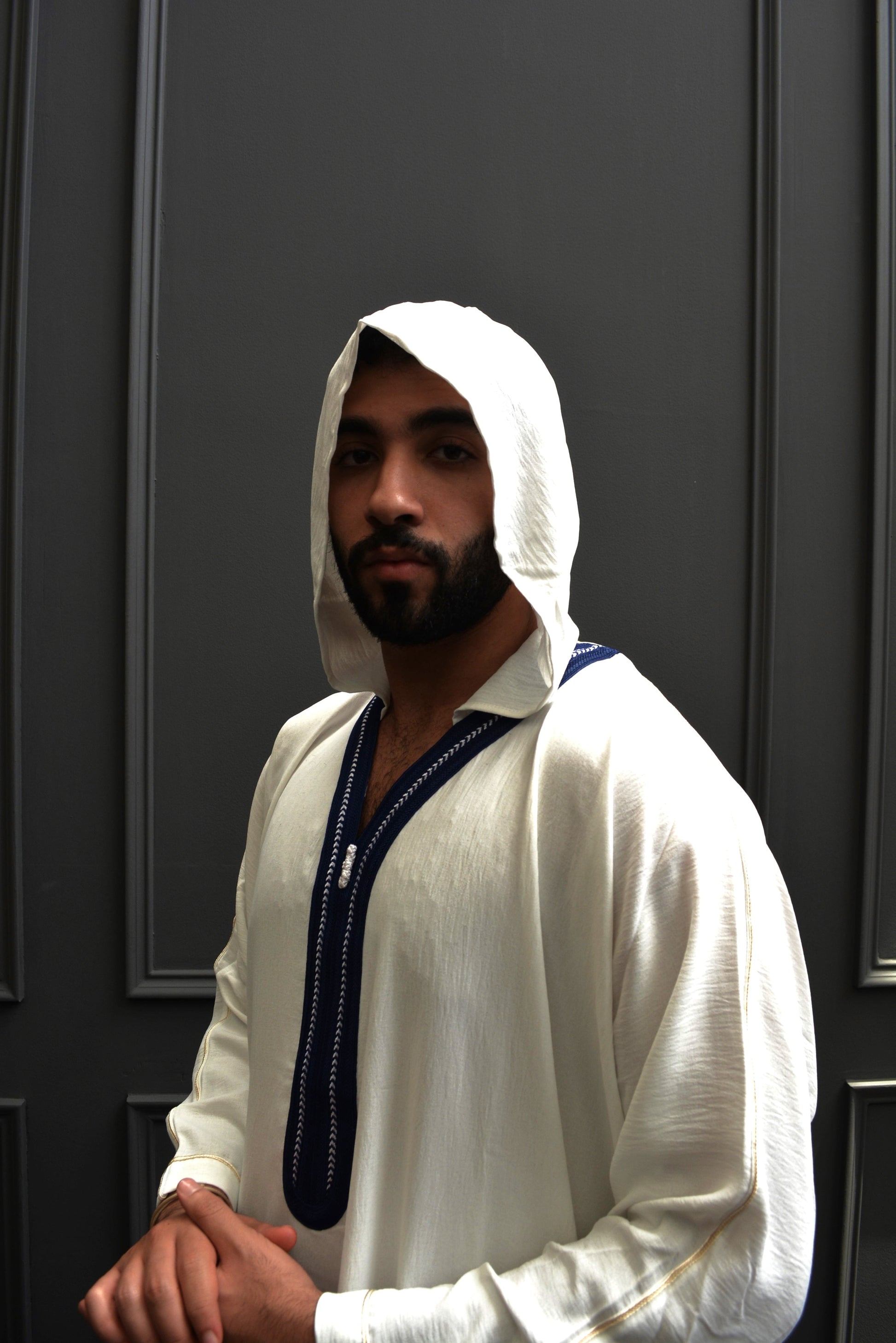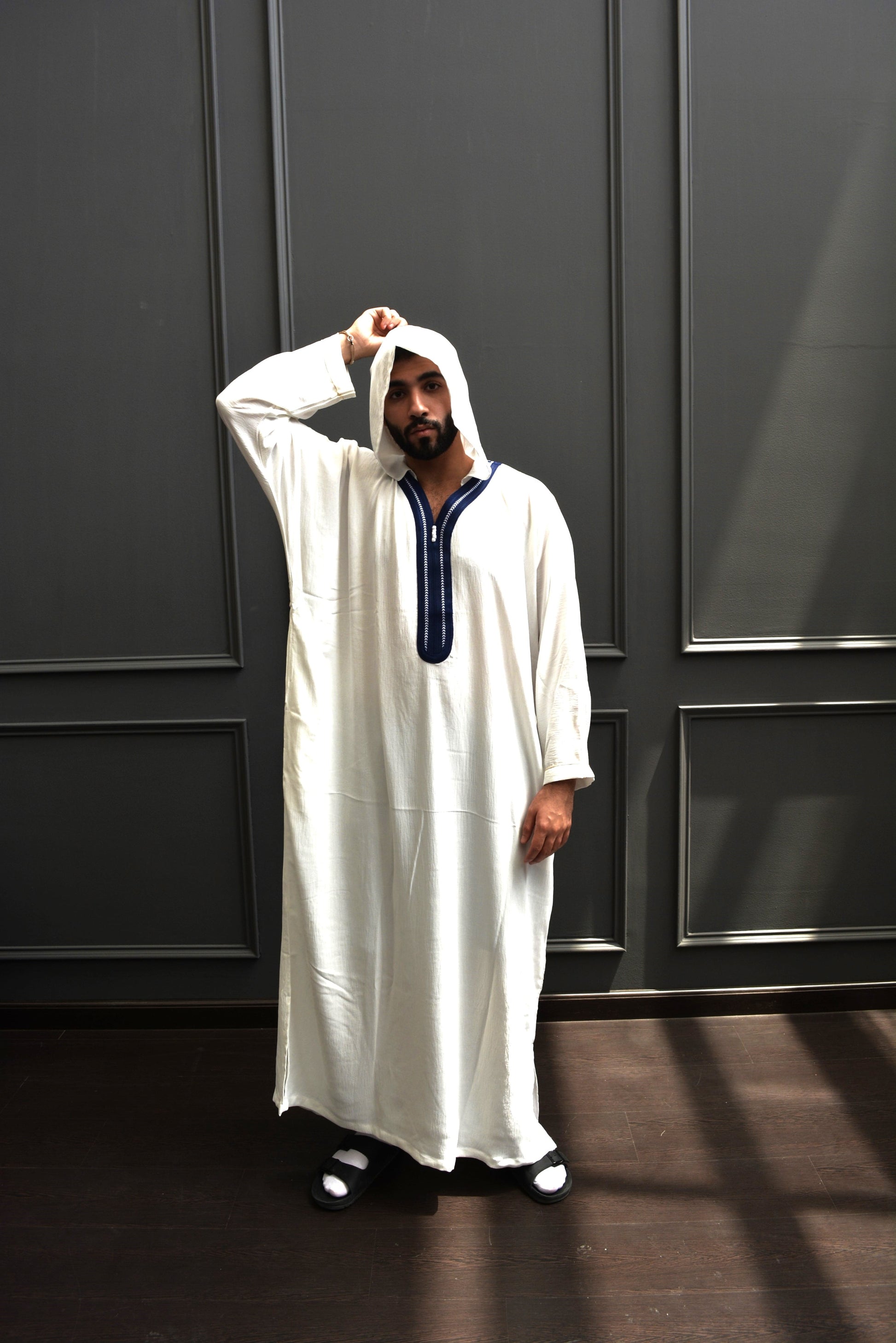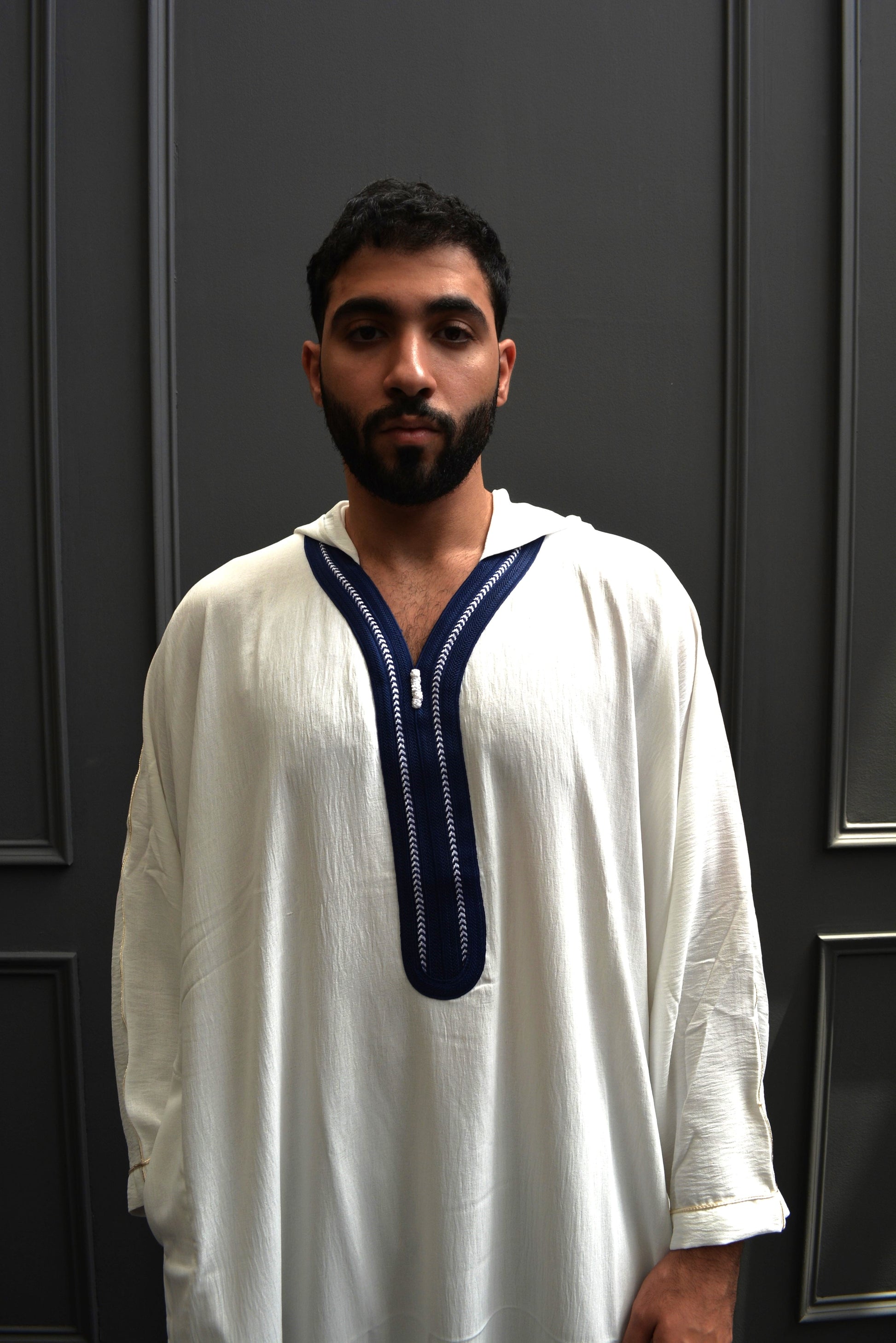 The best materials were used to make this elegant Moroccan thobe, but what really jumps out are the meticulous details of the tailor-made embroidery designs. This one-of-a-kind piece includes embroidery that begins at the shoulders and spreads to the V-neck, the chest region, the sleeves, and the bottom.