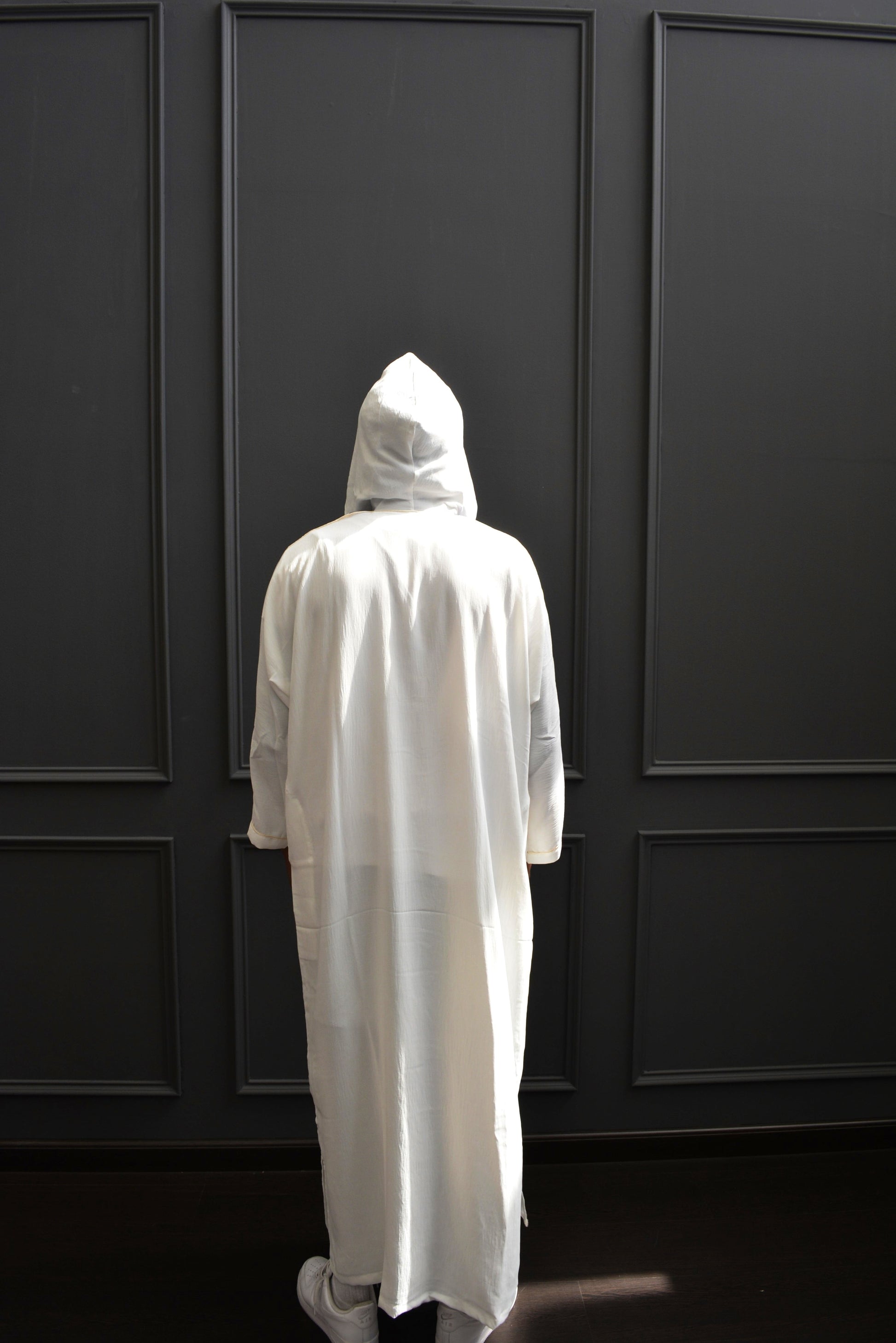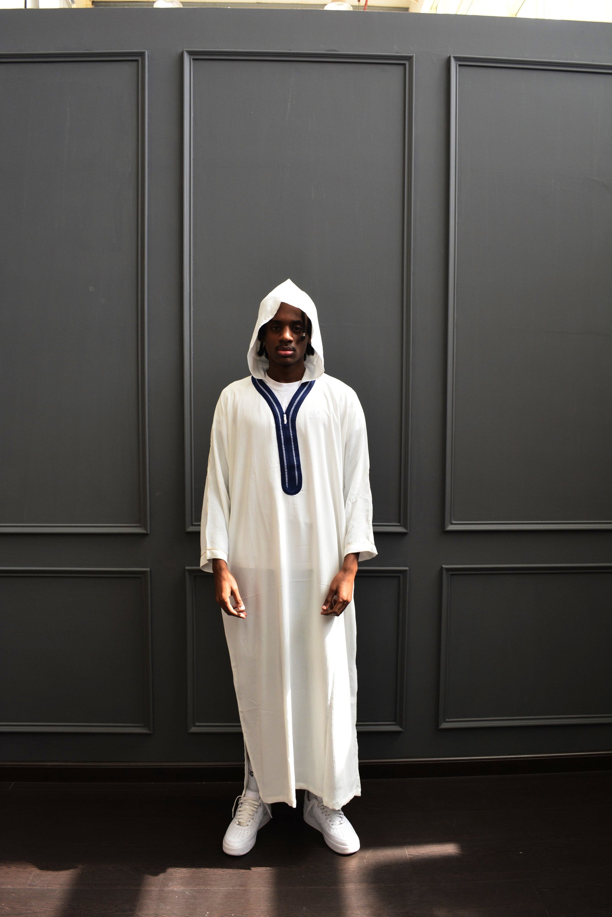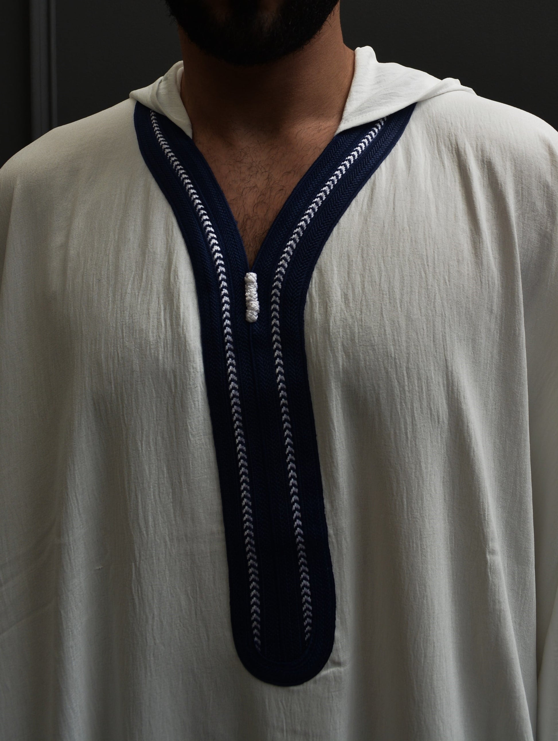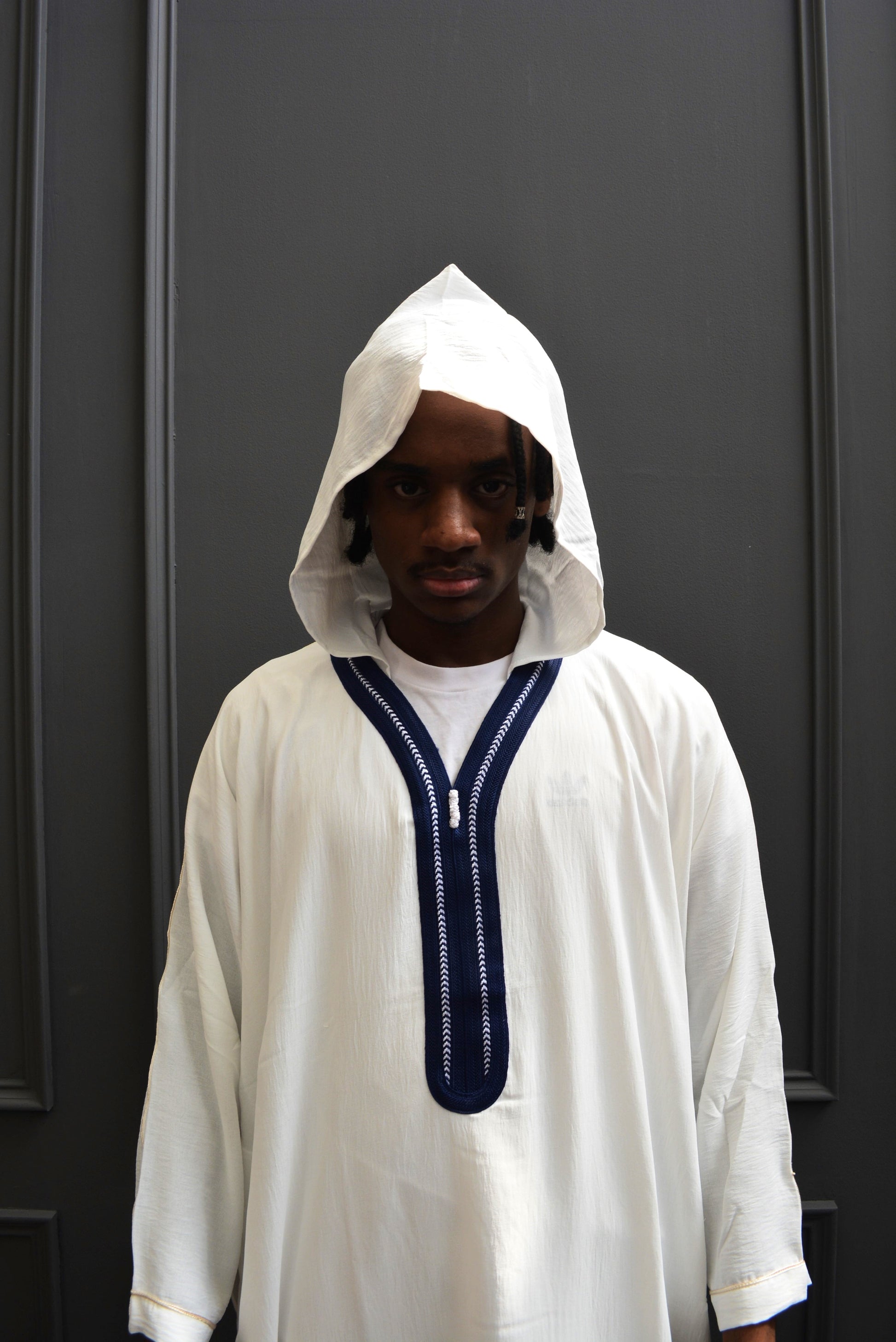The best materials were used to make this elegant Moroccan thobe, but what really jumps out are the meticulous details of the tailor-made embroidery designs. This one-of-a-kind piece includes embroidery that begins at the shoulders and spreads to the V-neck, the chest region, the sleeves, and the bottom.